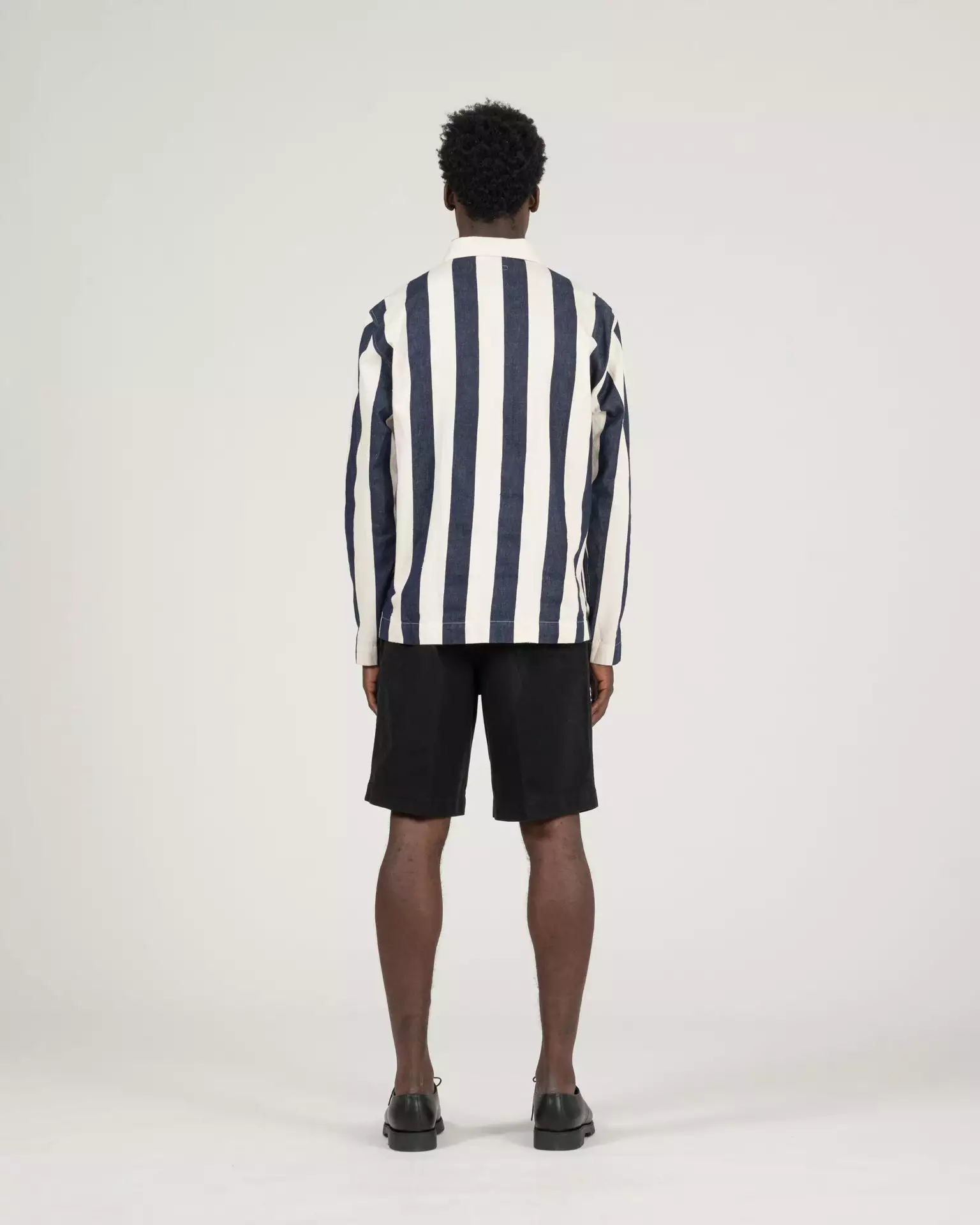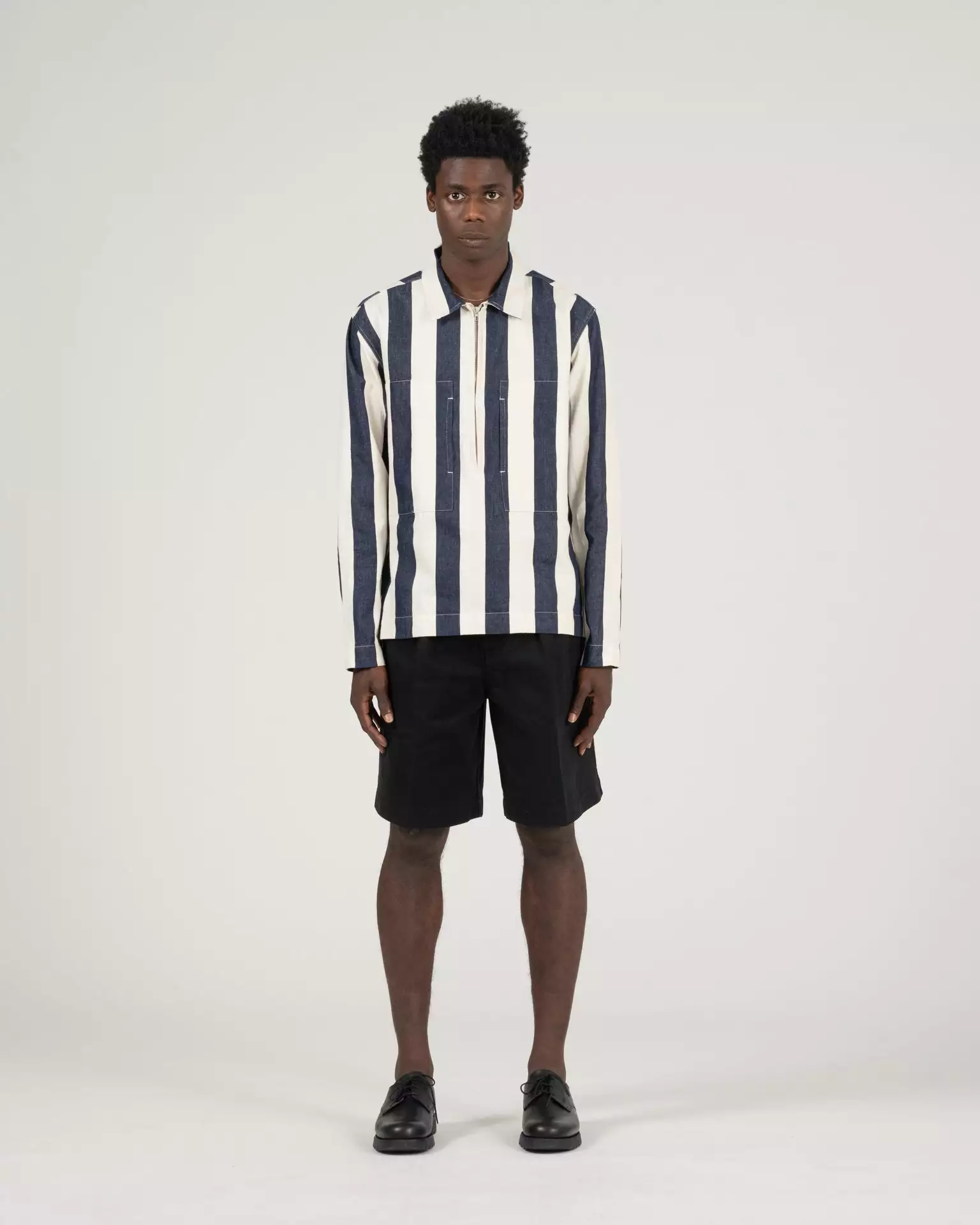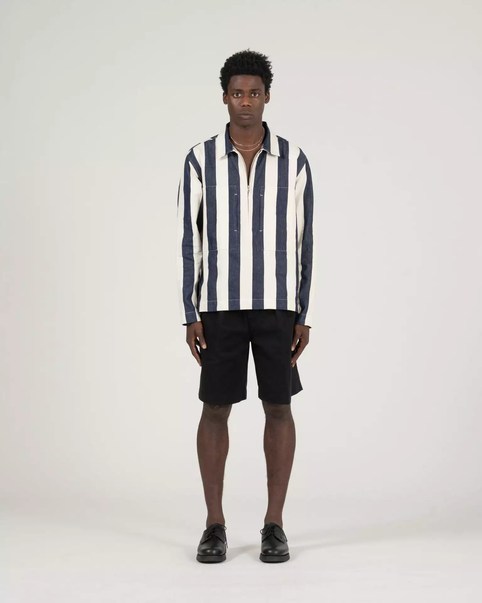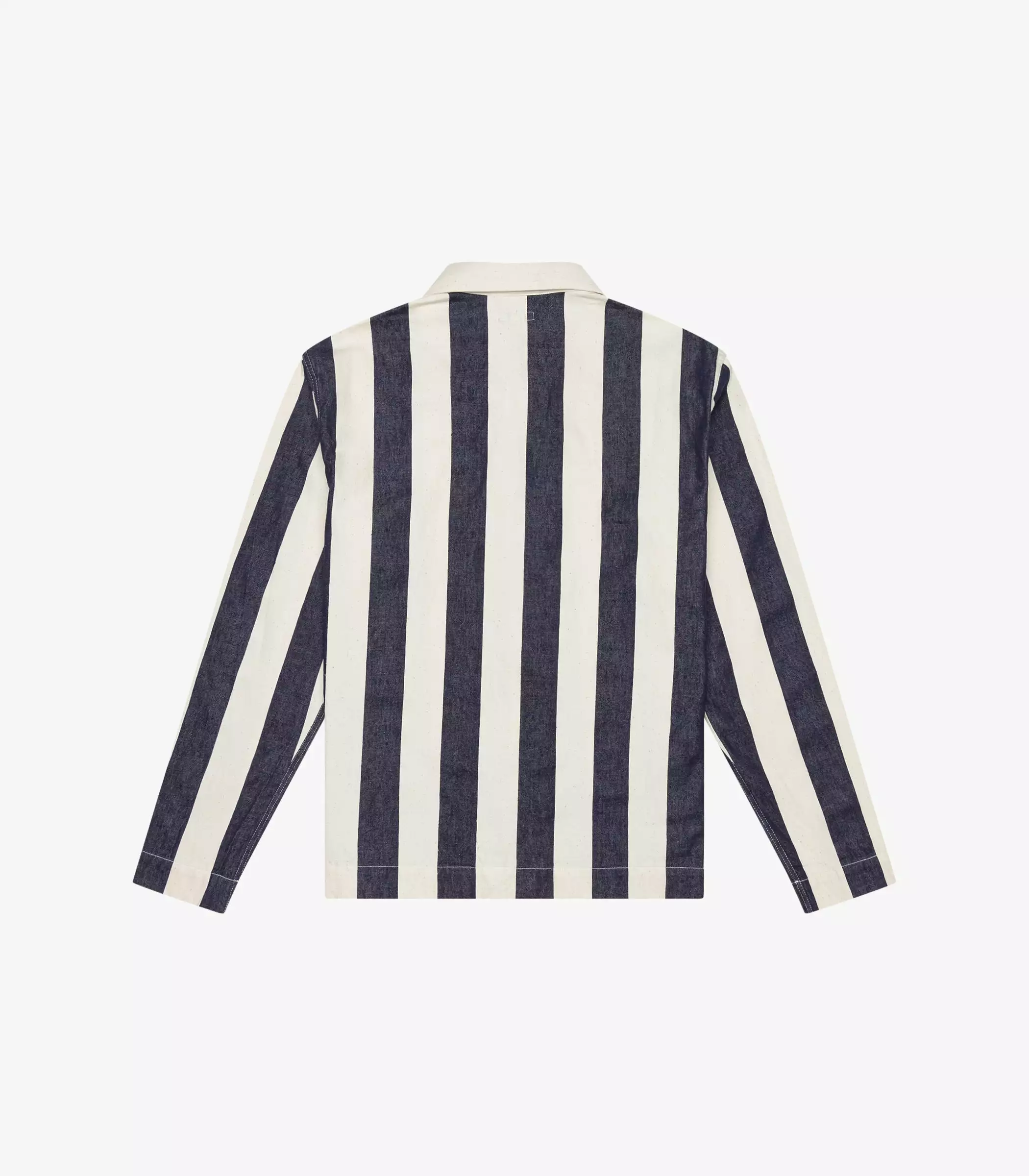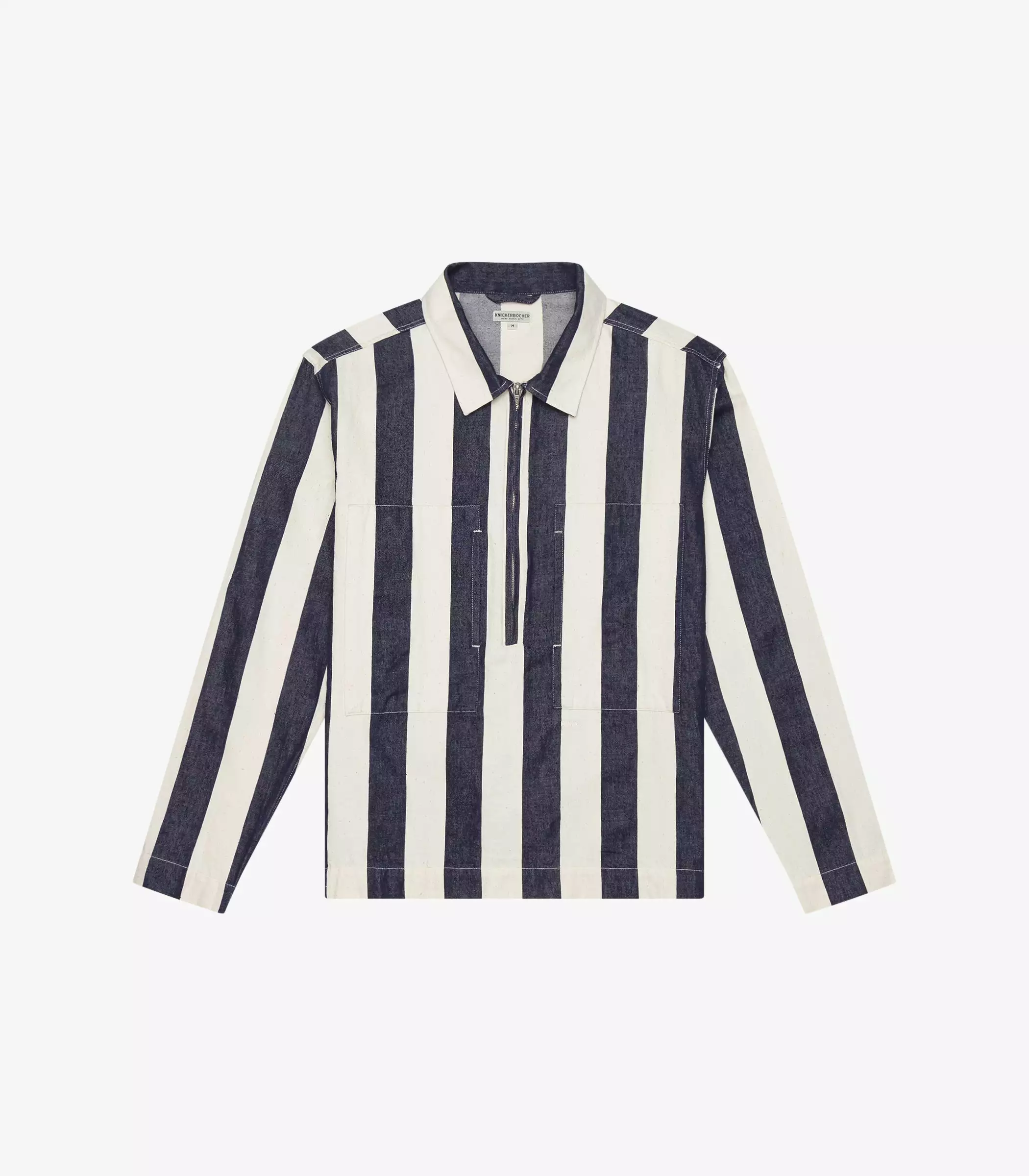 The 37 Pullover Shirt in blue/white stripe. Made of a yarn dyed stripe cotton twill sourced from Japan. Features a Talon zipper and K.N.Y. embroidered monogram.