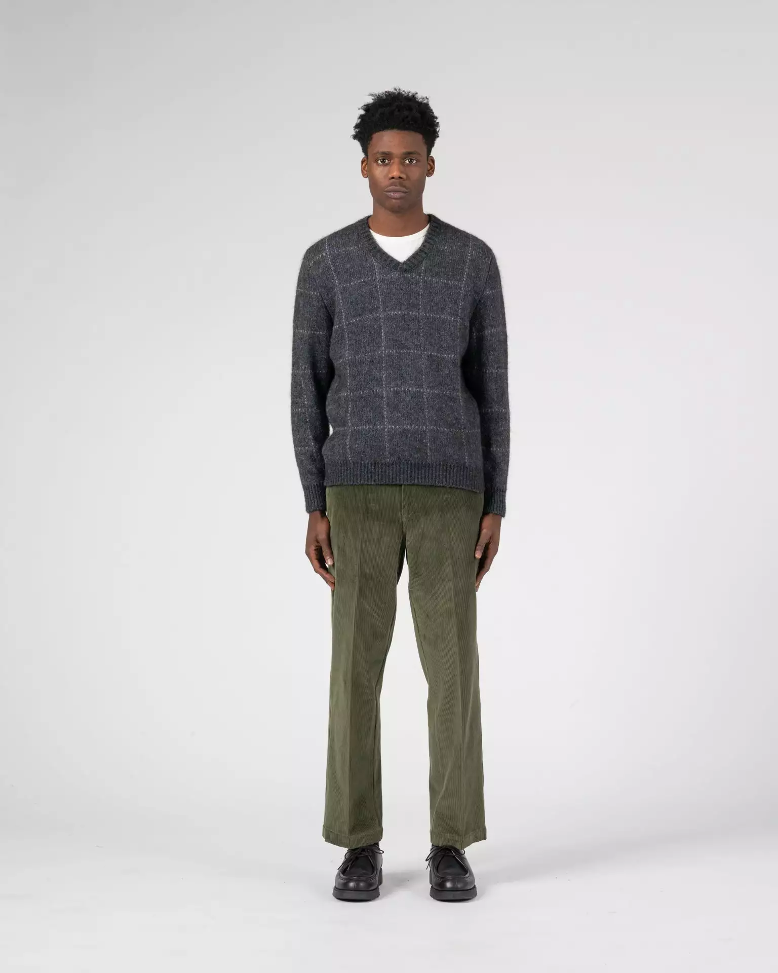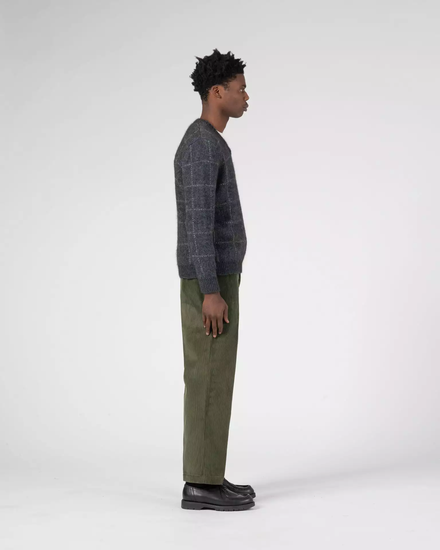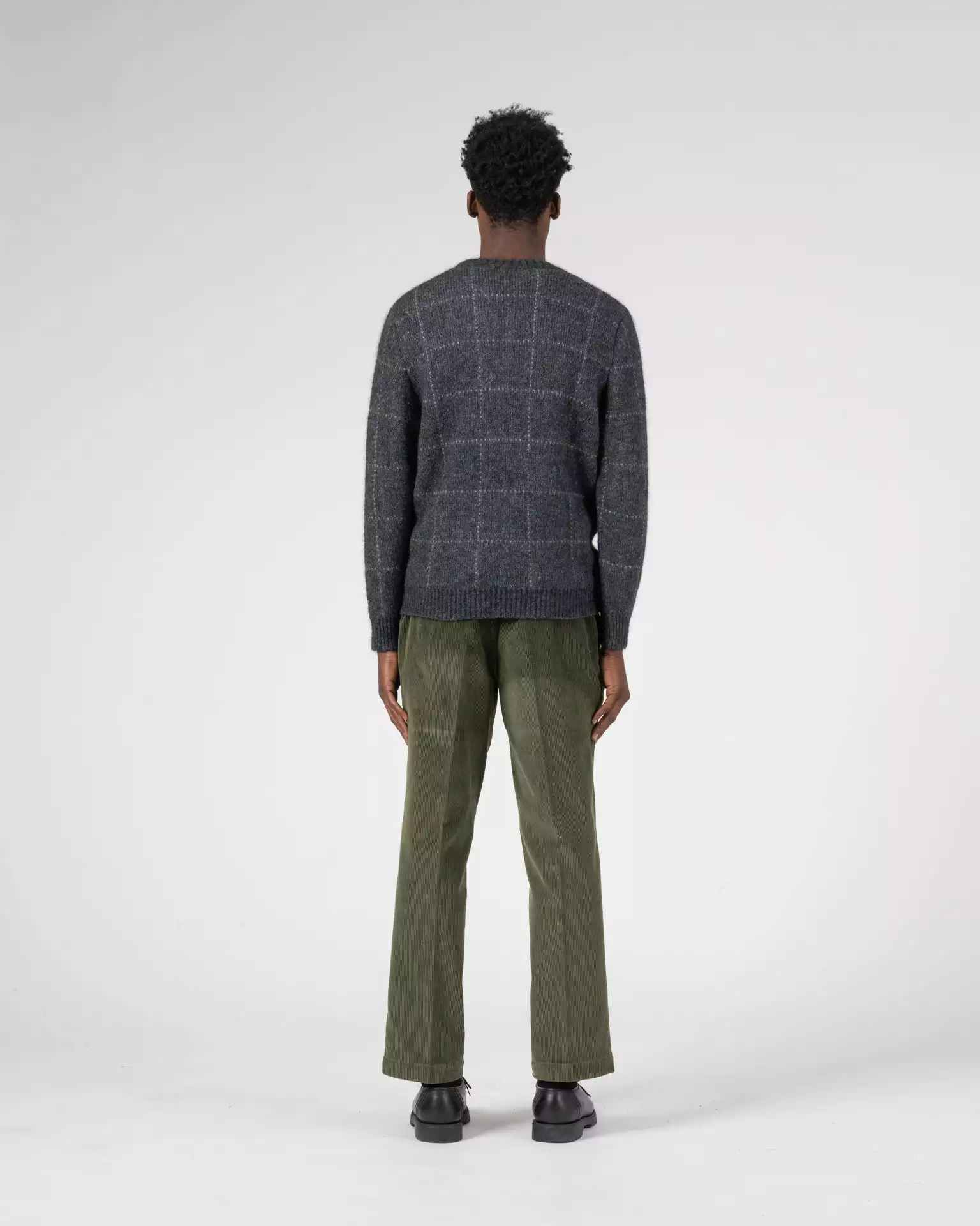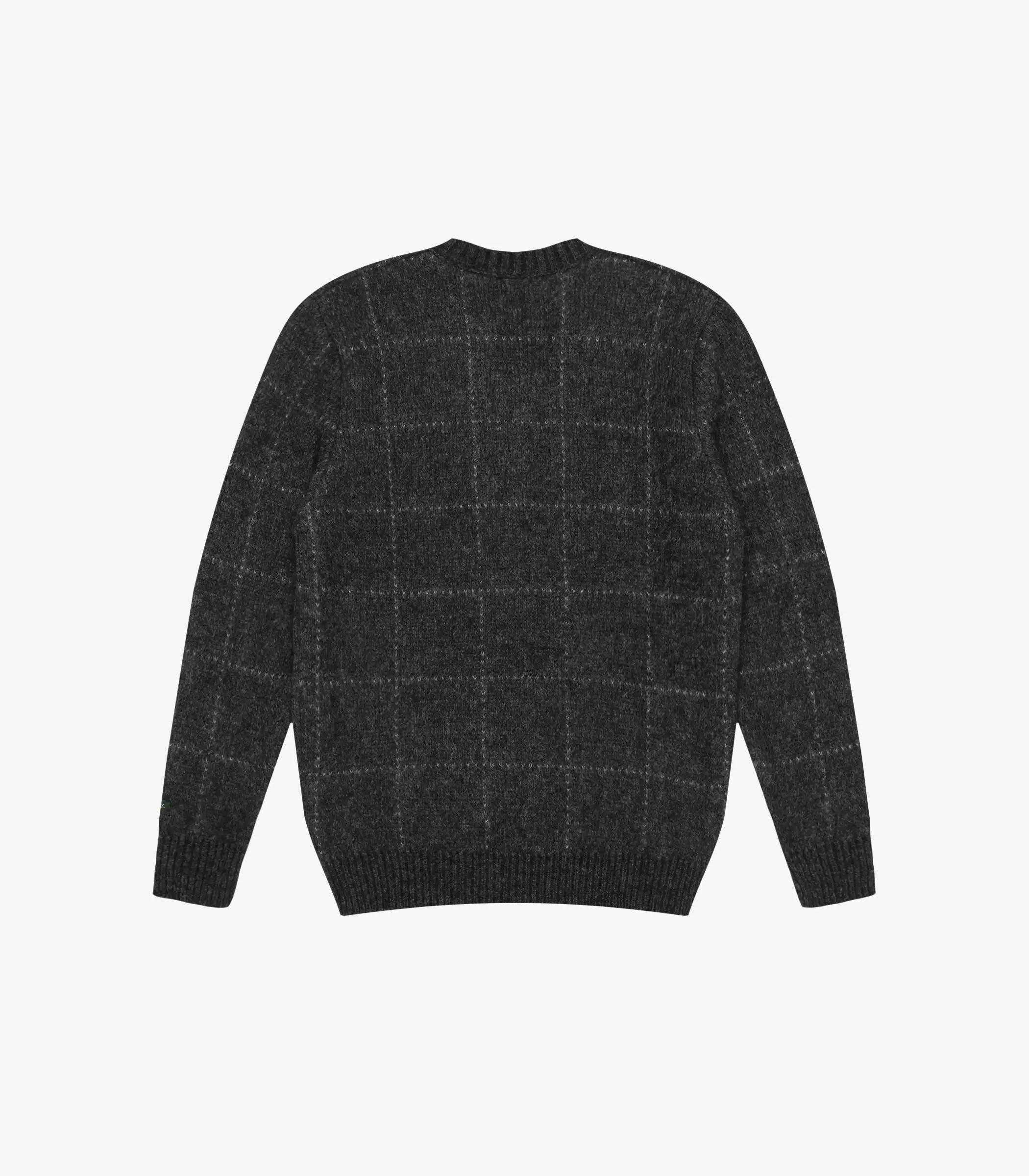Made of alpaca wool and polyamide blend sourced from Italy. Alpaca is a premium yarn known for its light, fine and warm characteristics. The sweater features a button front and Knickerbocker label sewn above the rib of wearer’s left sleeve.