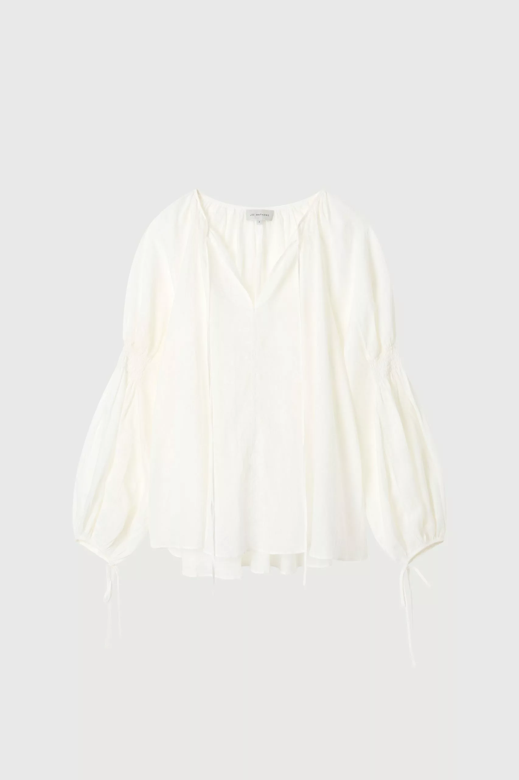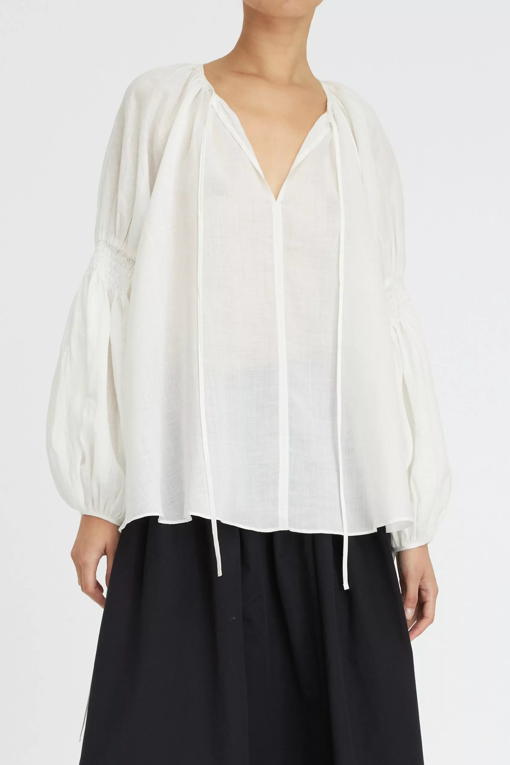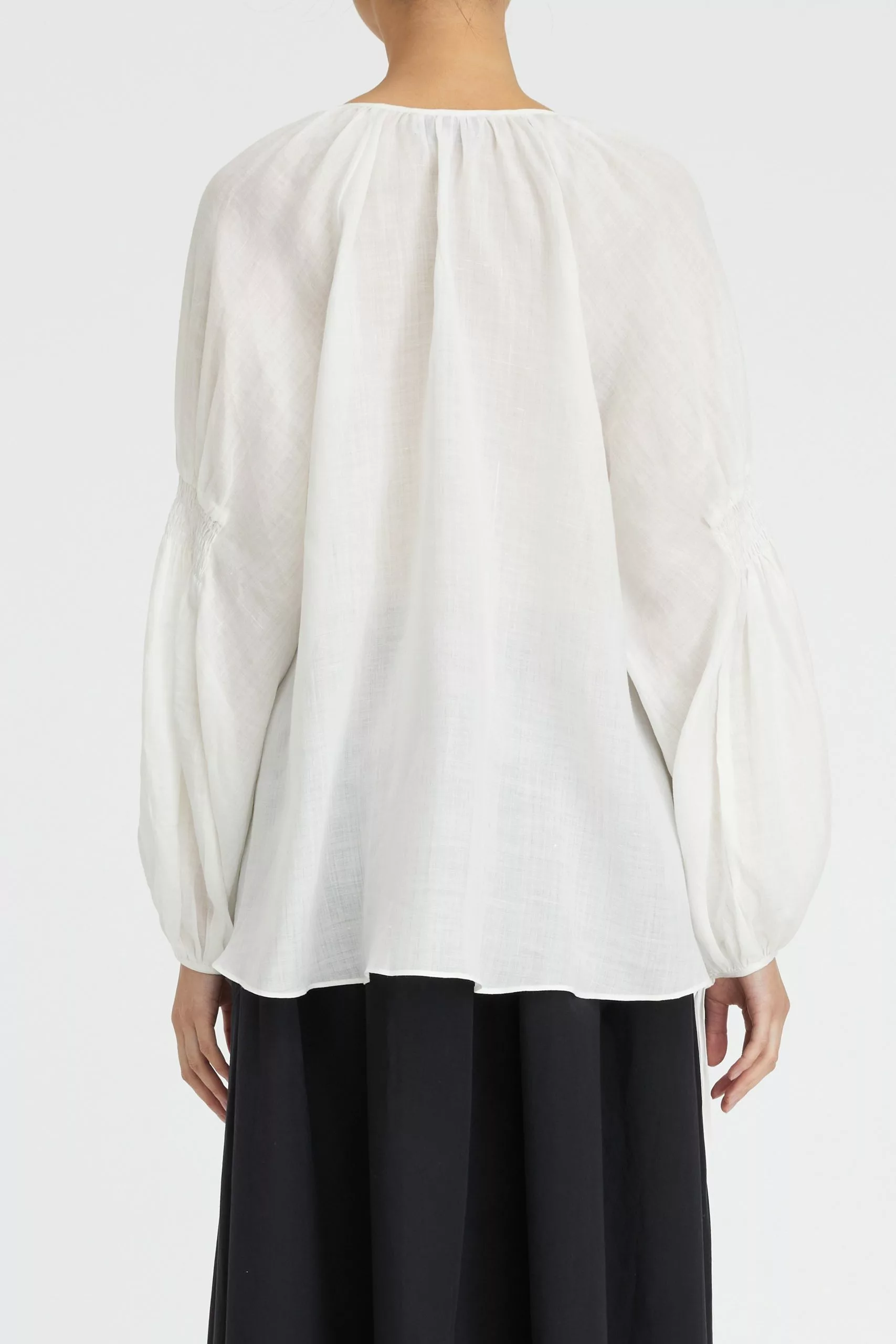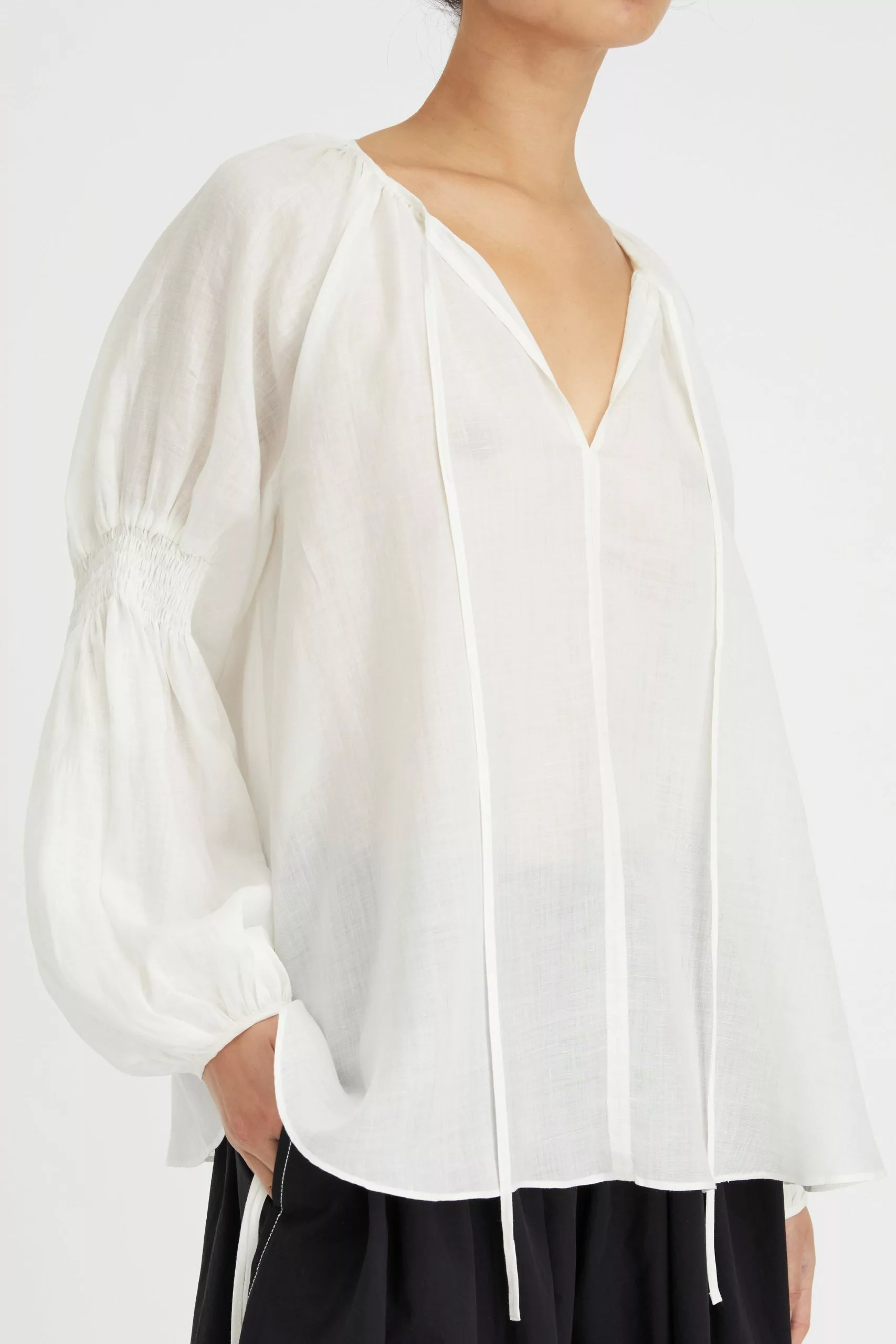 The Blossom Long Sleeve Top is a relaxed summer blouse made from 100% ramie. Featuring a softened v-neckline and voluminous sleeves with smocking detail, the Blossom Top is a breathable piece designed for easy wear. Style with silk separates to create an elevated look, or pair with linen for effortless weekend outfitting.