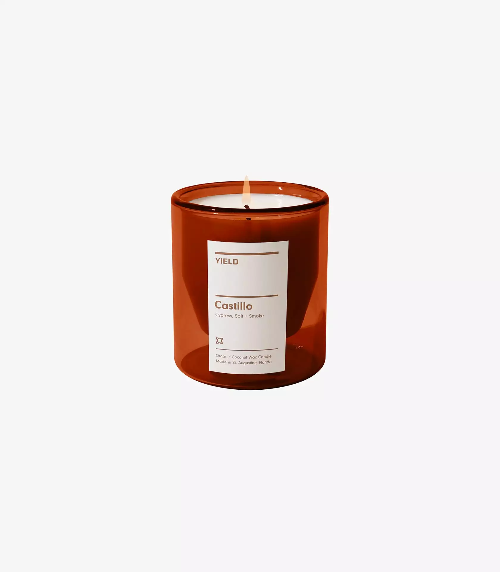 The Castillo Candle. Organic coconut wax. Deep notes of cypress, salt + smoke. Essential oil and fragrance oil blend. Reusable double-walled glass vessel. Produced by YIELD, an independent Florida based designer and manufacturer.