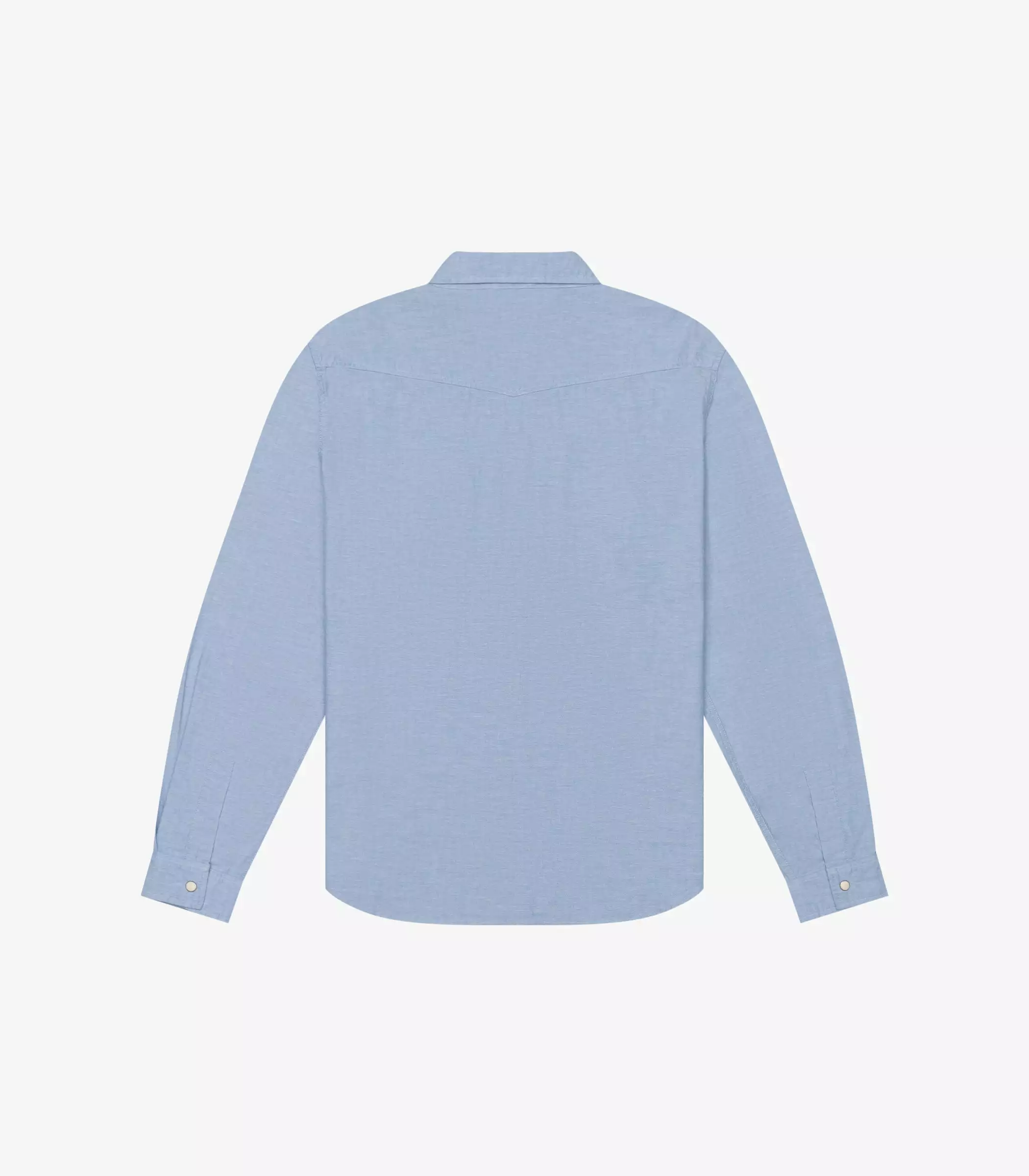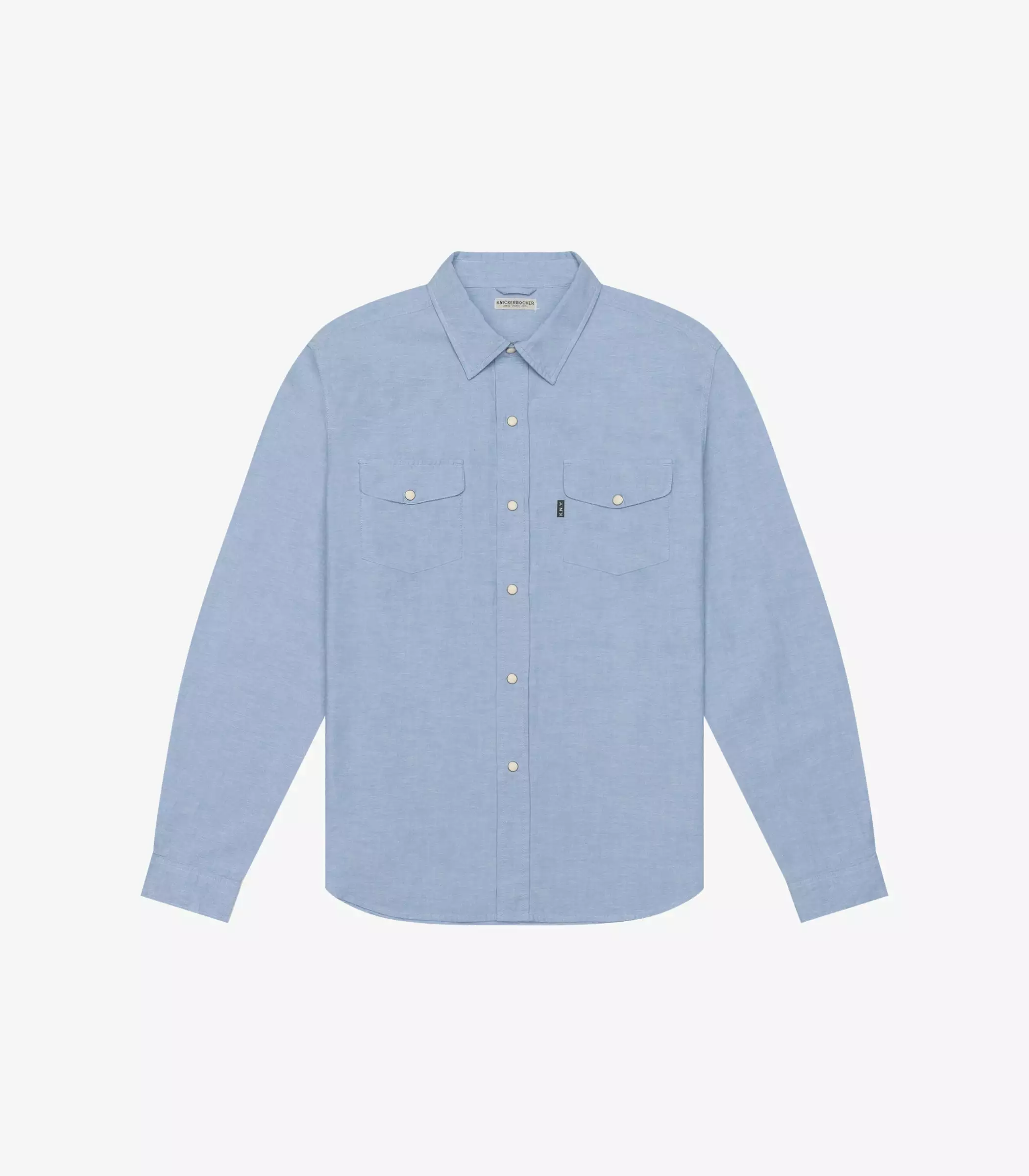 The Chambray Paris Western in light blue is made of a cotton chambray sourced from Portugal. Features faux horn snaps, two chest pockets and a Knickerbocker tab clench label sewn in the left pocket seam.