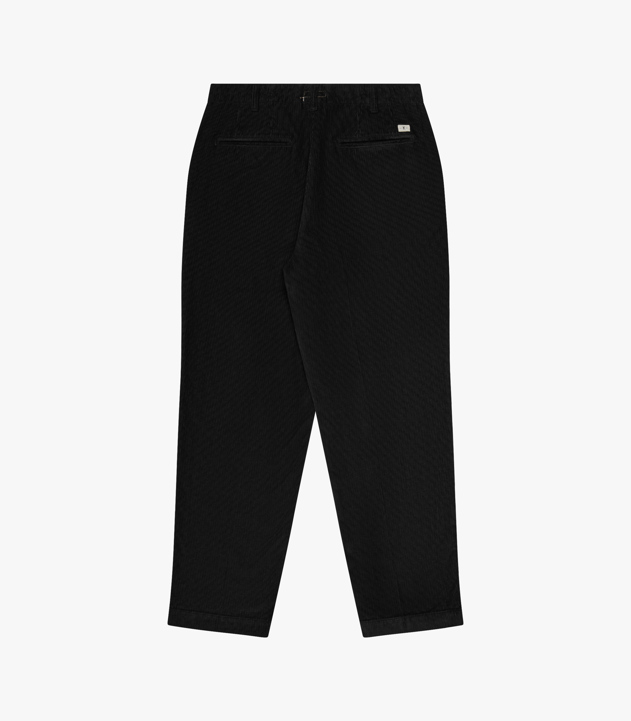 The Corduroy Flat Front Pant in black. Made of a brushed cotton corduroy. Features Talon zipper fly, top button closure and signature “K” label on back pocket. Fit is a straight leg with taper.
