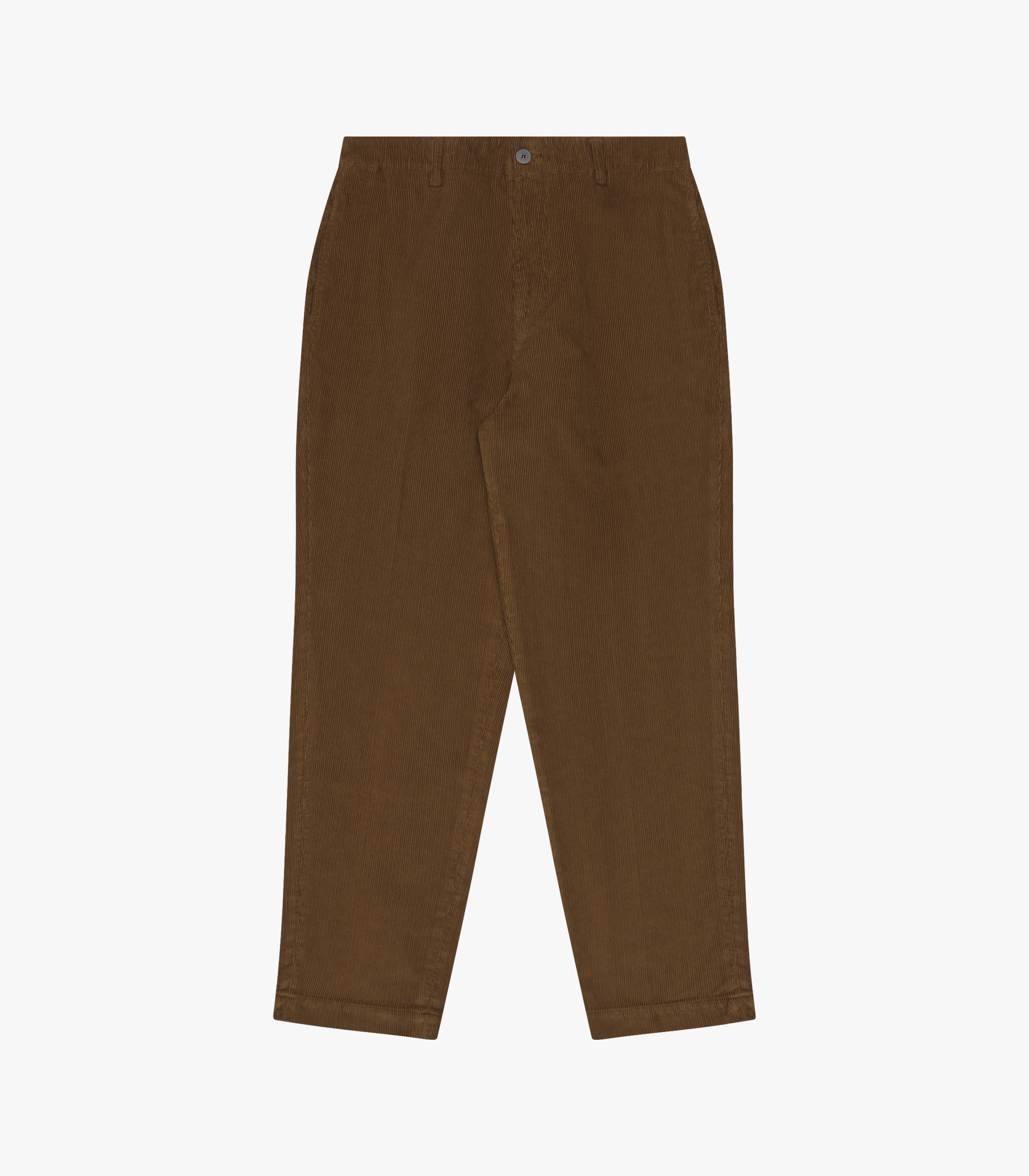 The Corduroy Flat Front Pant in brown. Made of a brushed cotton corduroy. Features Talon zipper fly, top button closure and signature “K” label on back pocket. Fit is a straight leg with taper.