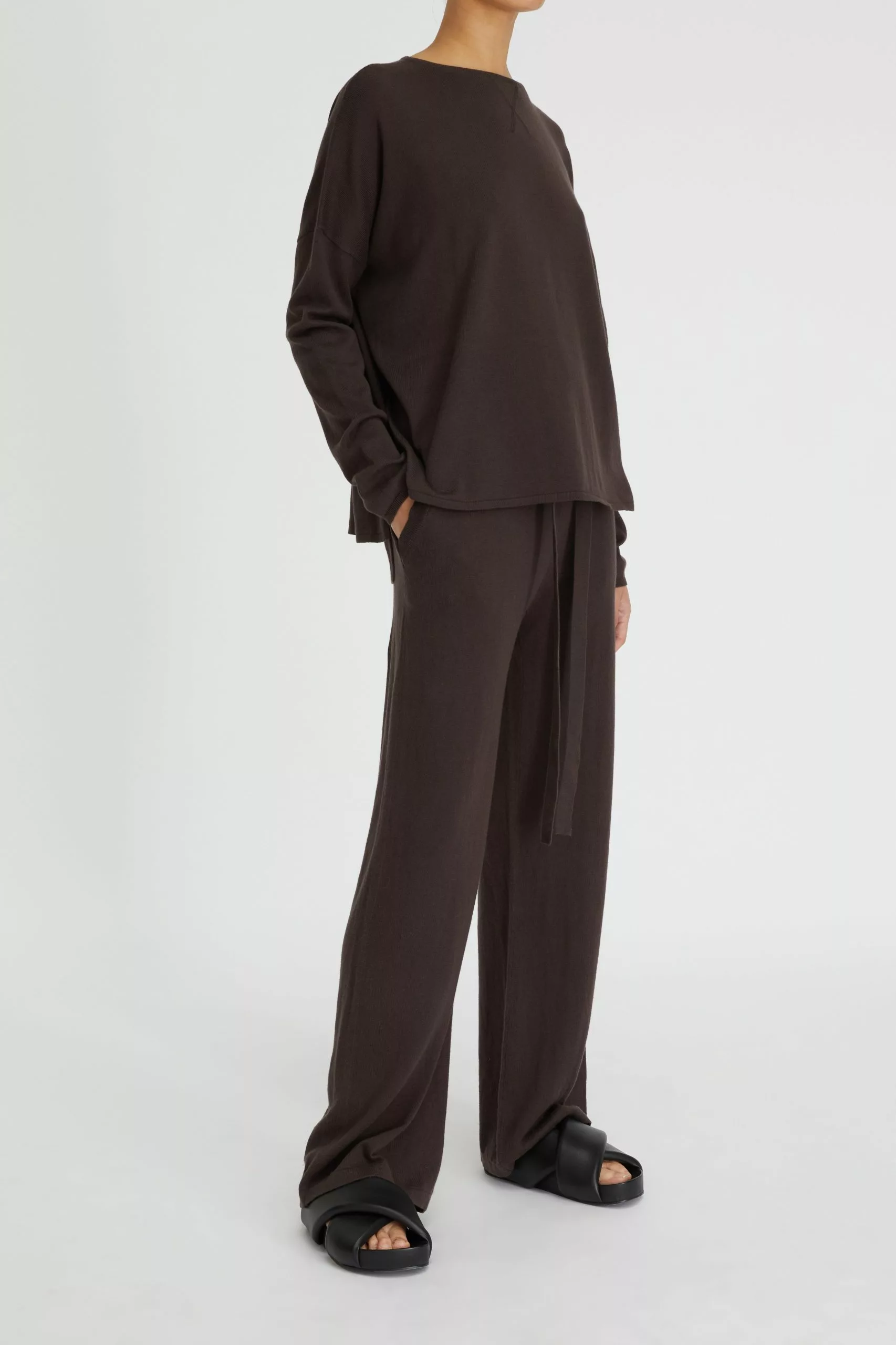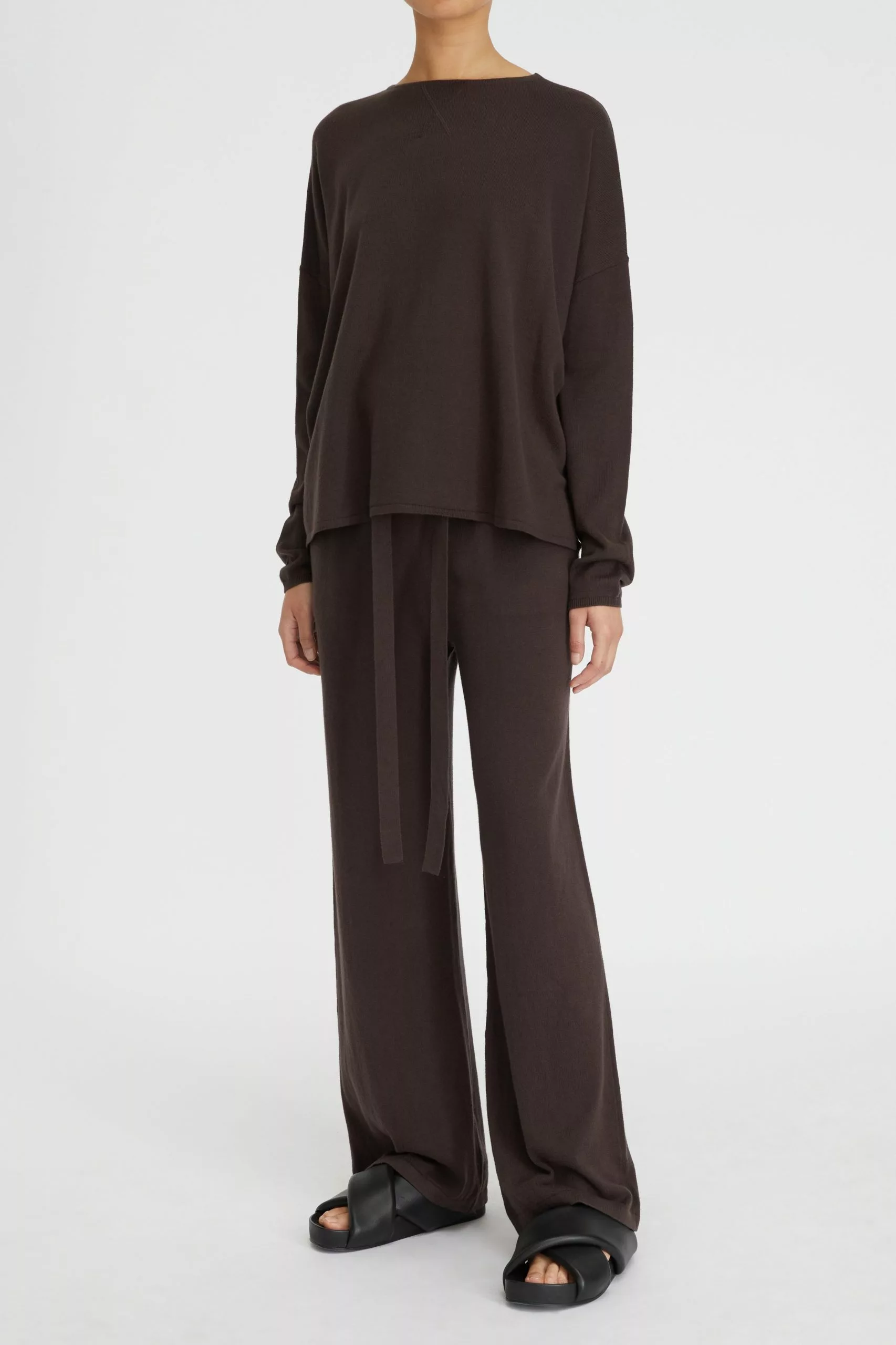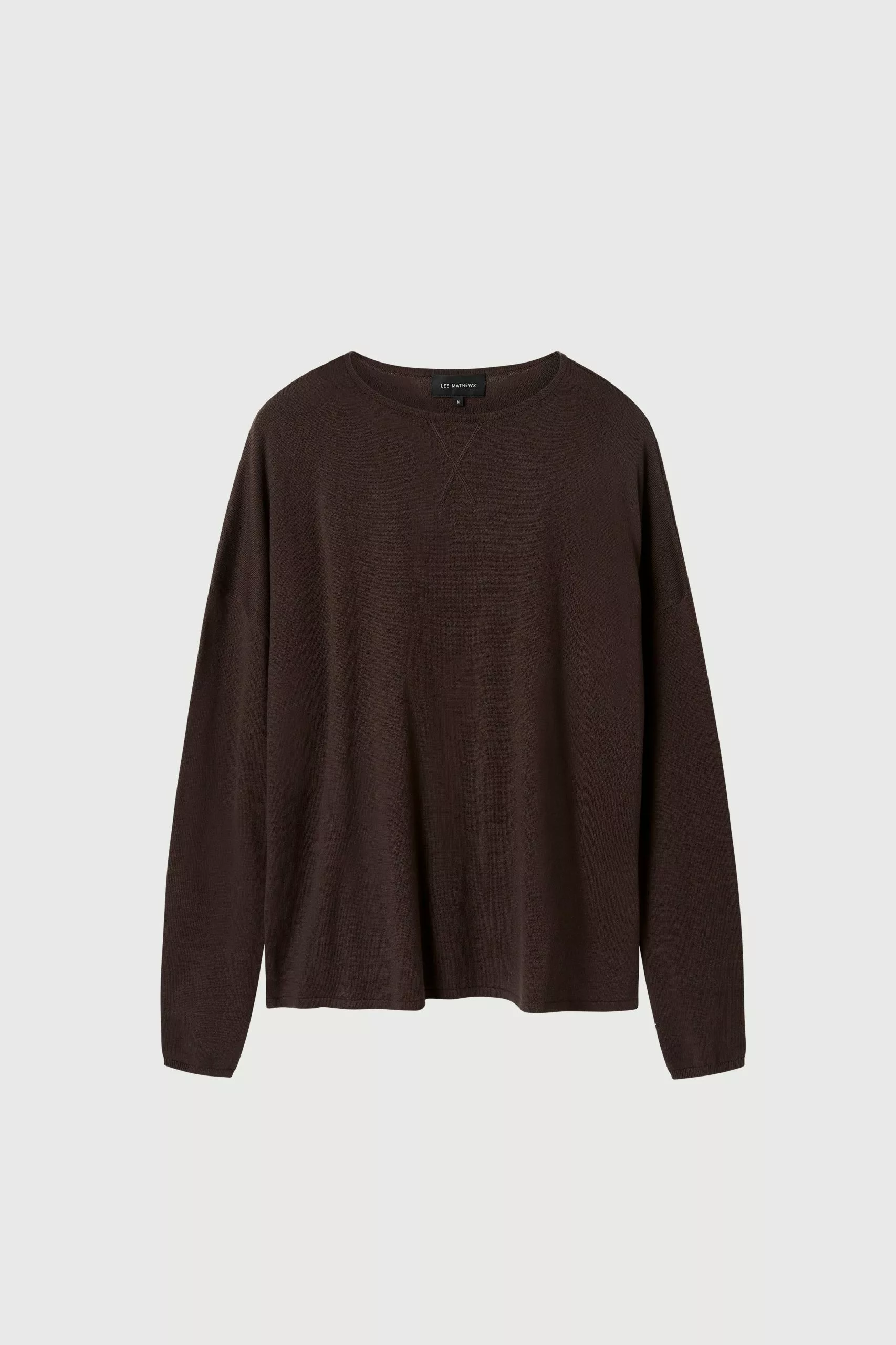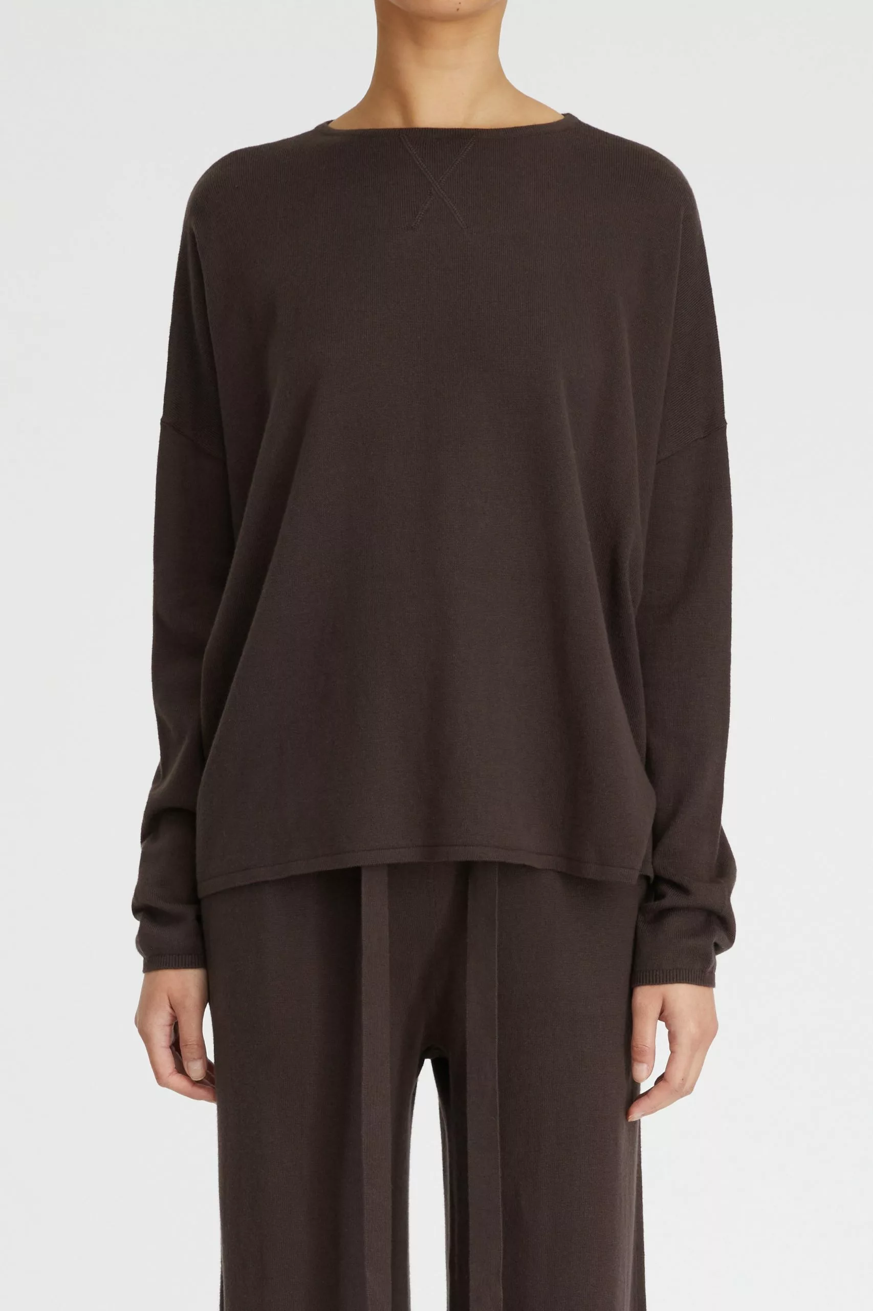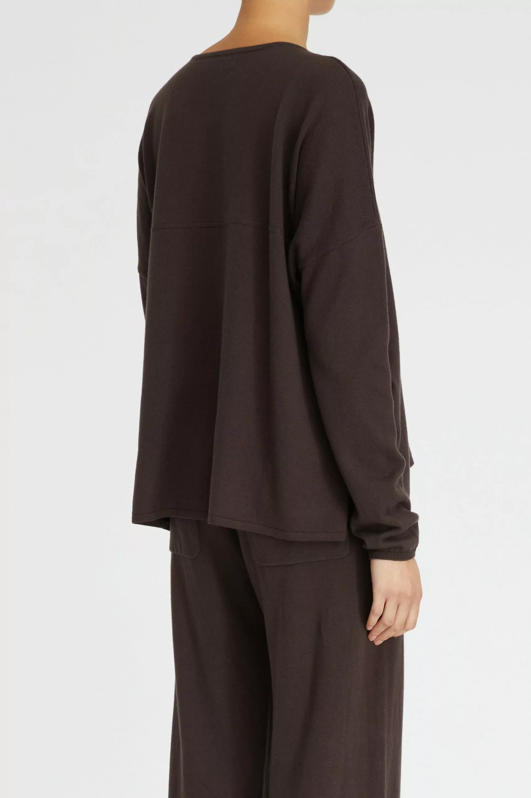 The Cotton Cashmere Boxy Knit in Chocolate is a Lee Mathews essential made from a luxurious blend of cotton and cashmere. Knitted with a wide boat neck this sweater features dropped shoulders, a straight back yoke, and rolled hem finishes. Style this elevated basic with the coordinating Cotton Cashmere Track Pant or silk satin separates.