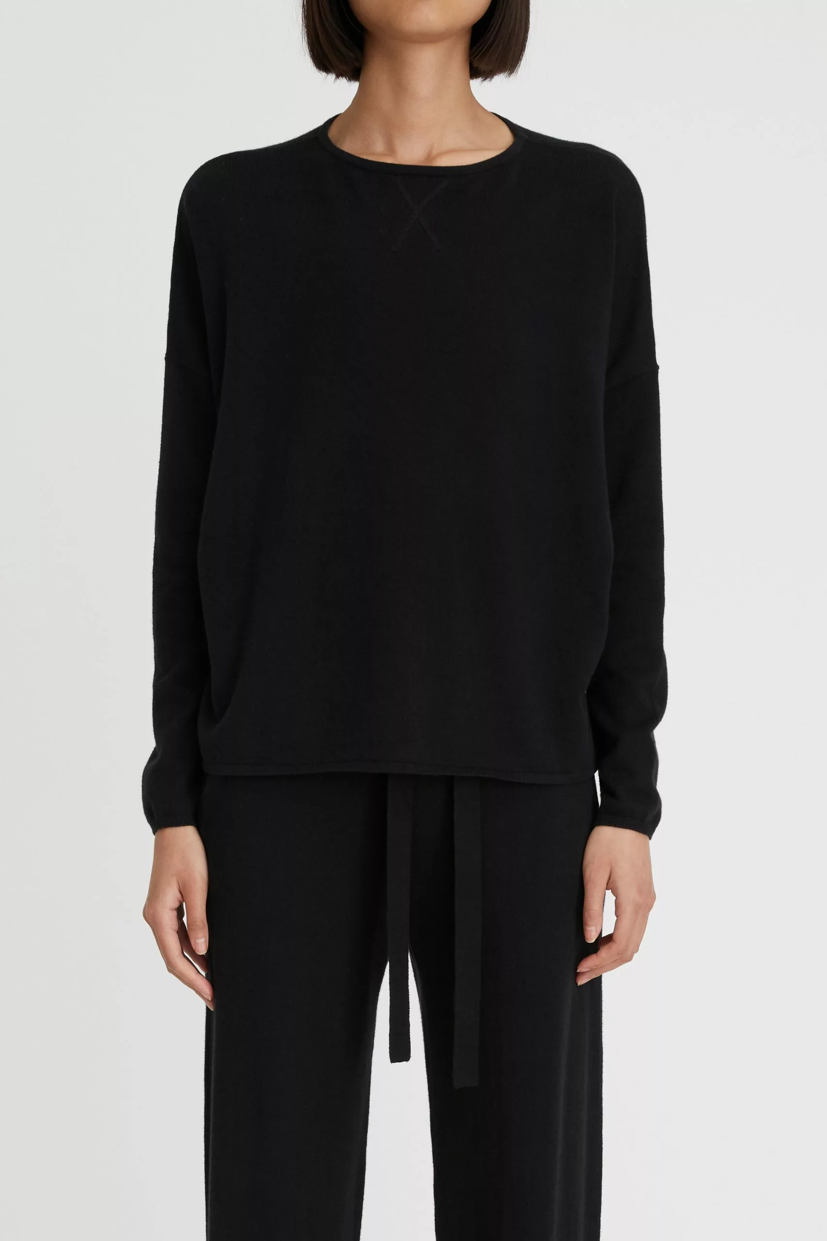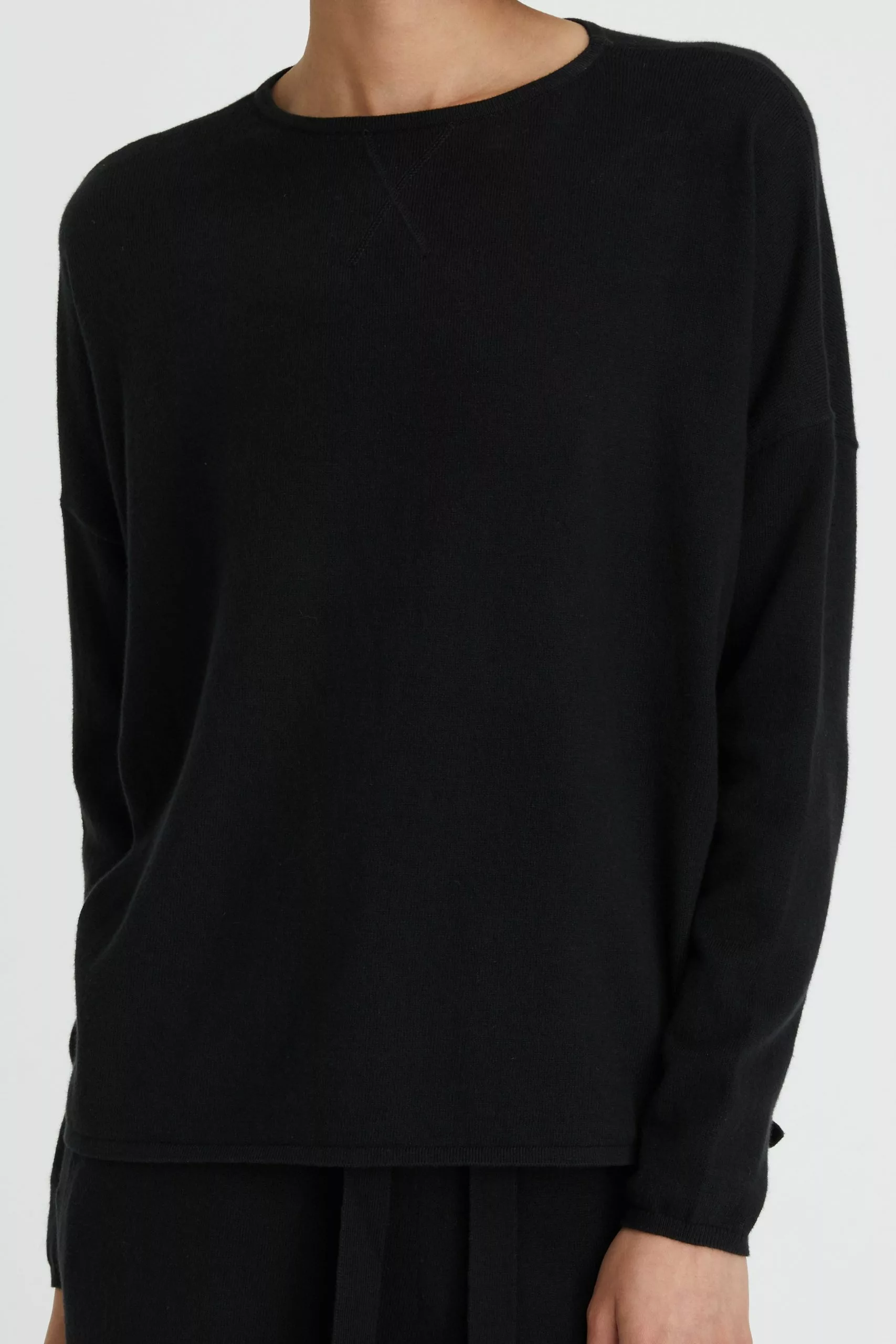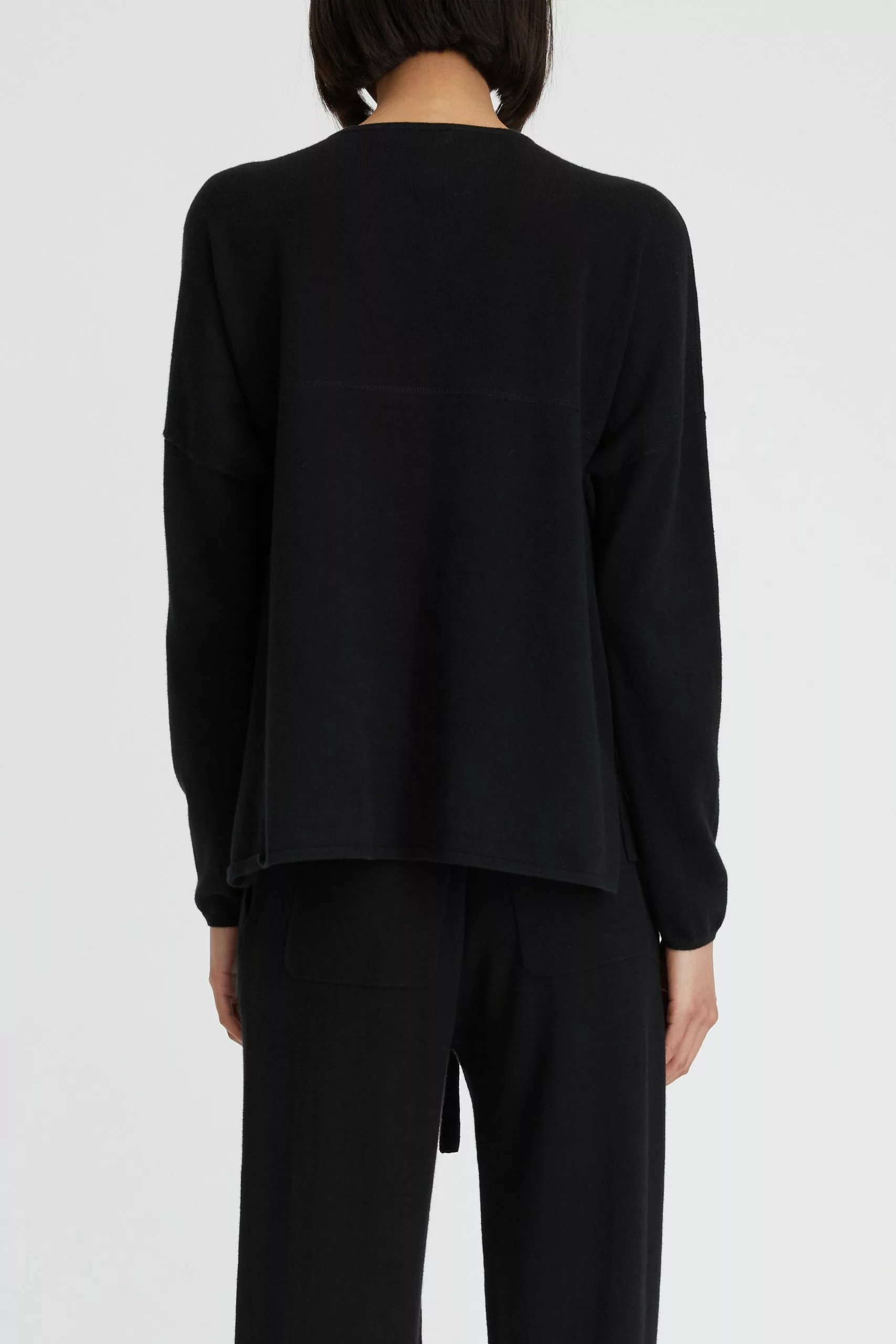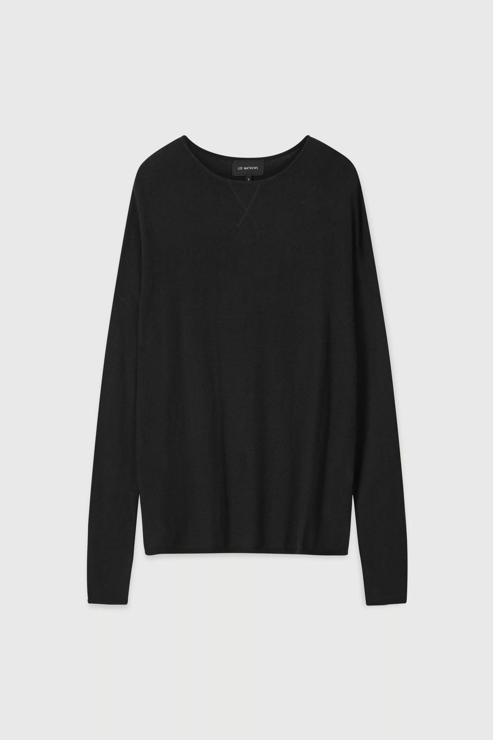 The Cotton Cashmere Boxy Knit in Black is a Lee Mathews essential made from a luxurious blend of cotton and cashmere. Knitted with a wide boat neck this sweater features dropped shoulders, a straight back yoke, and rolled hem finishes. Style this elevated basic with the coordinating Cotton Cashmere Track Pant or silk satin separates.Â