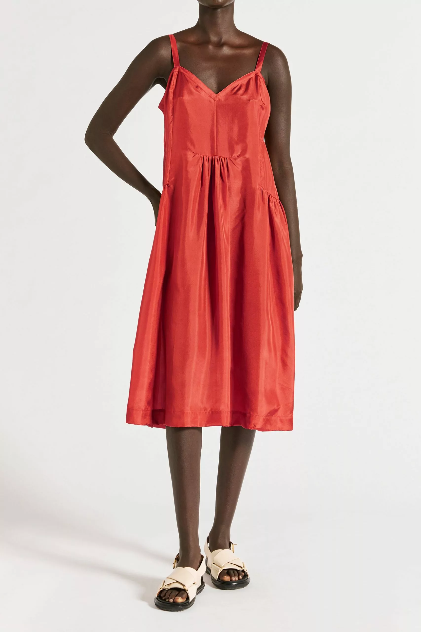 LM Classic V Neck Gathered Slip in Raspberry from the Resort 22 collection is made from 100% silk. This sheer slip features a V neckline, adjustable straps, a gathered bust, and gathered detail at the hips. Style this dress under other garments for a pop of colour or wear it to the pool as a coverup over swimwear.