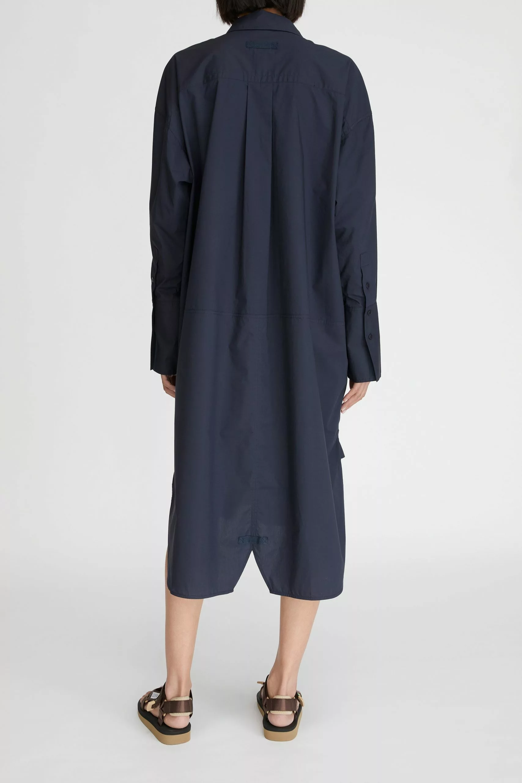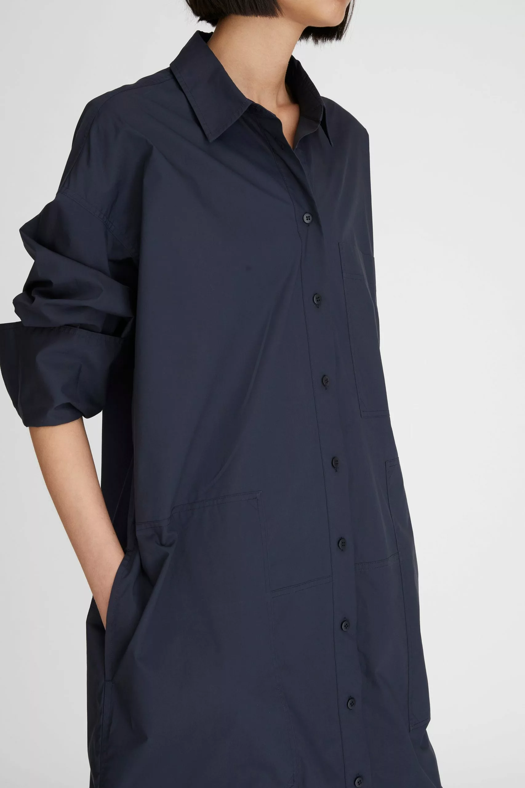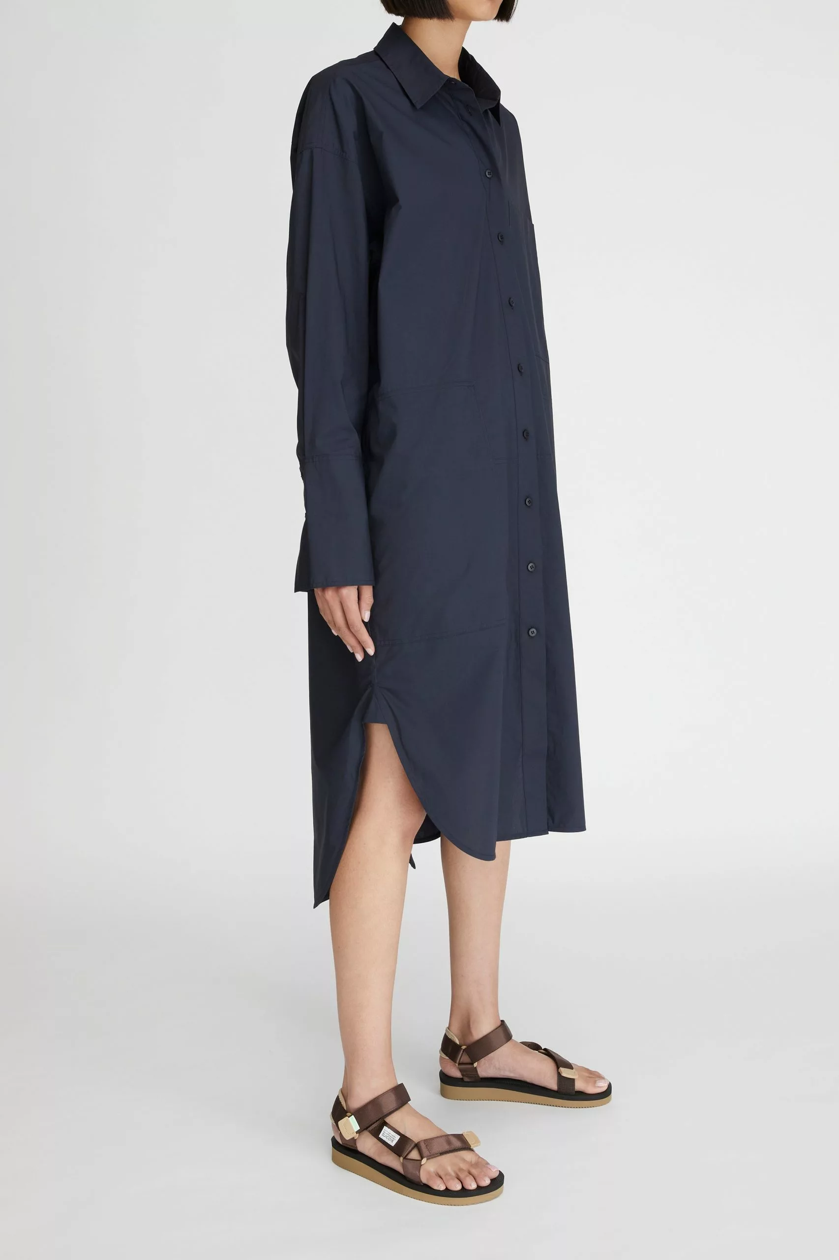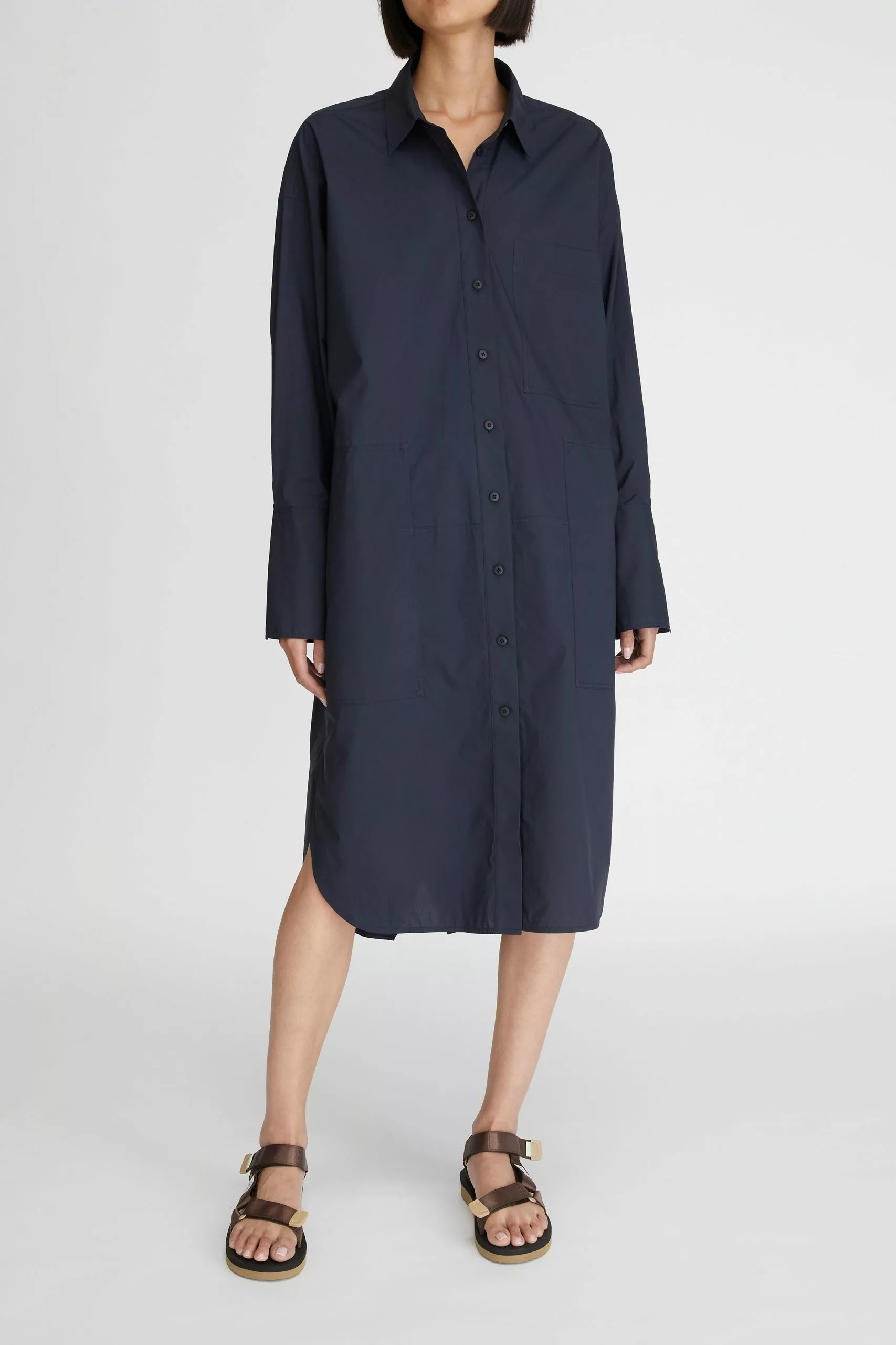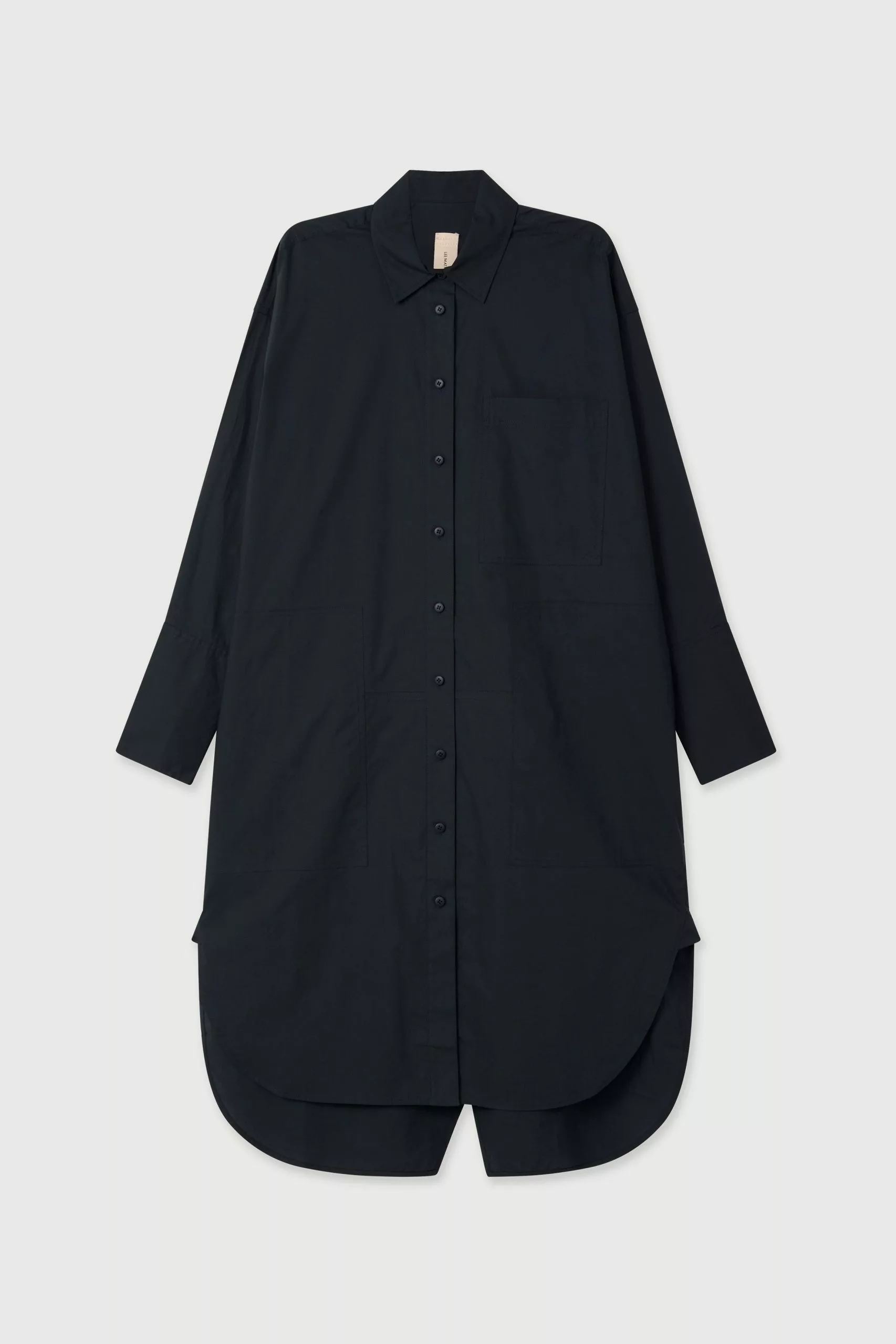 The LM Poplin Long Sleeve Shirt Dress in Navy from the Workroom collection is made from 100% organic cotton poplin. This relaxed-fit shirt dress features classic shirting details and is finished with deep cuffs, a curved hem, side splits and herringbone tape accents making it an LM everyday essential.