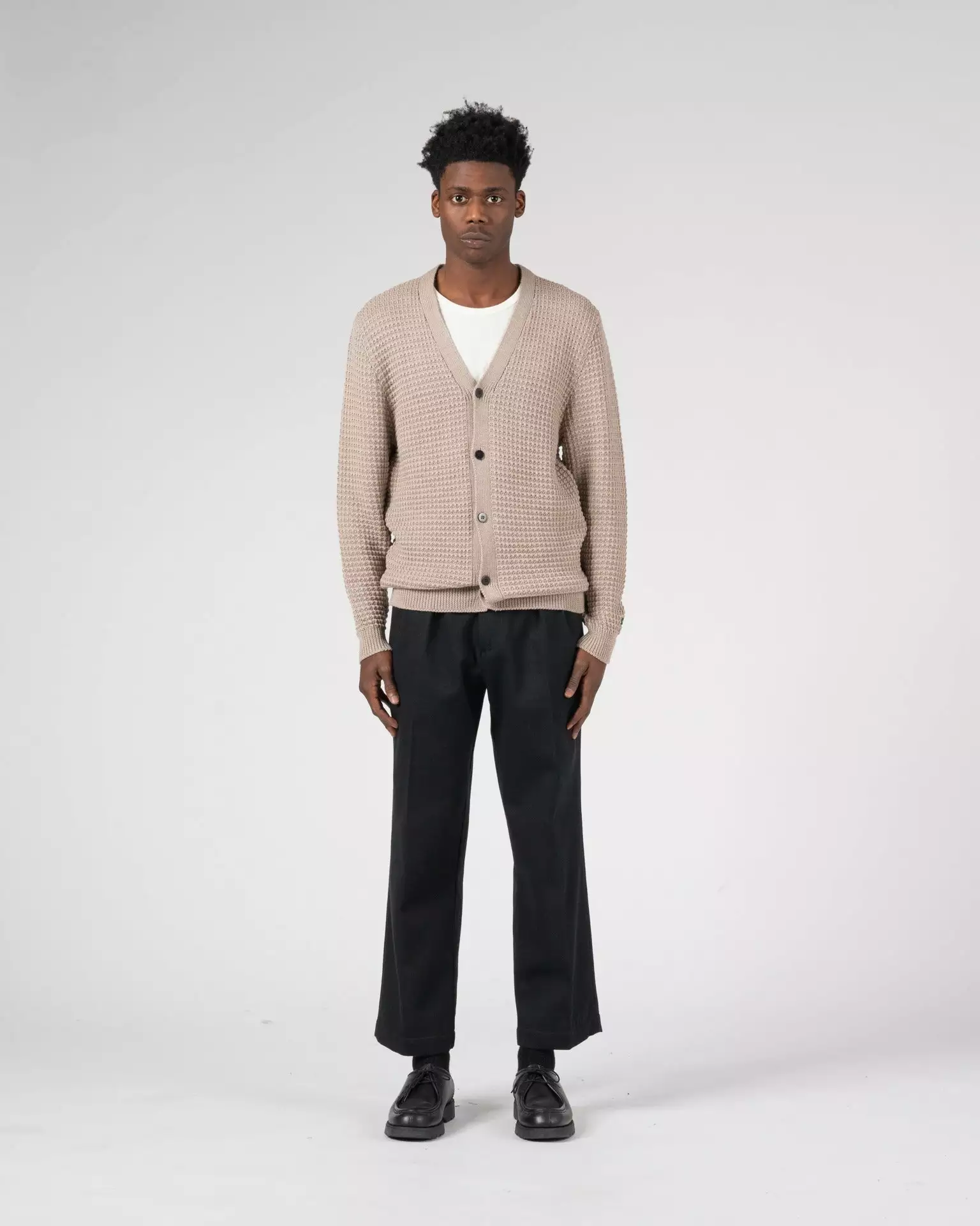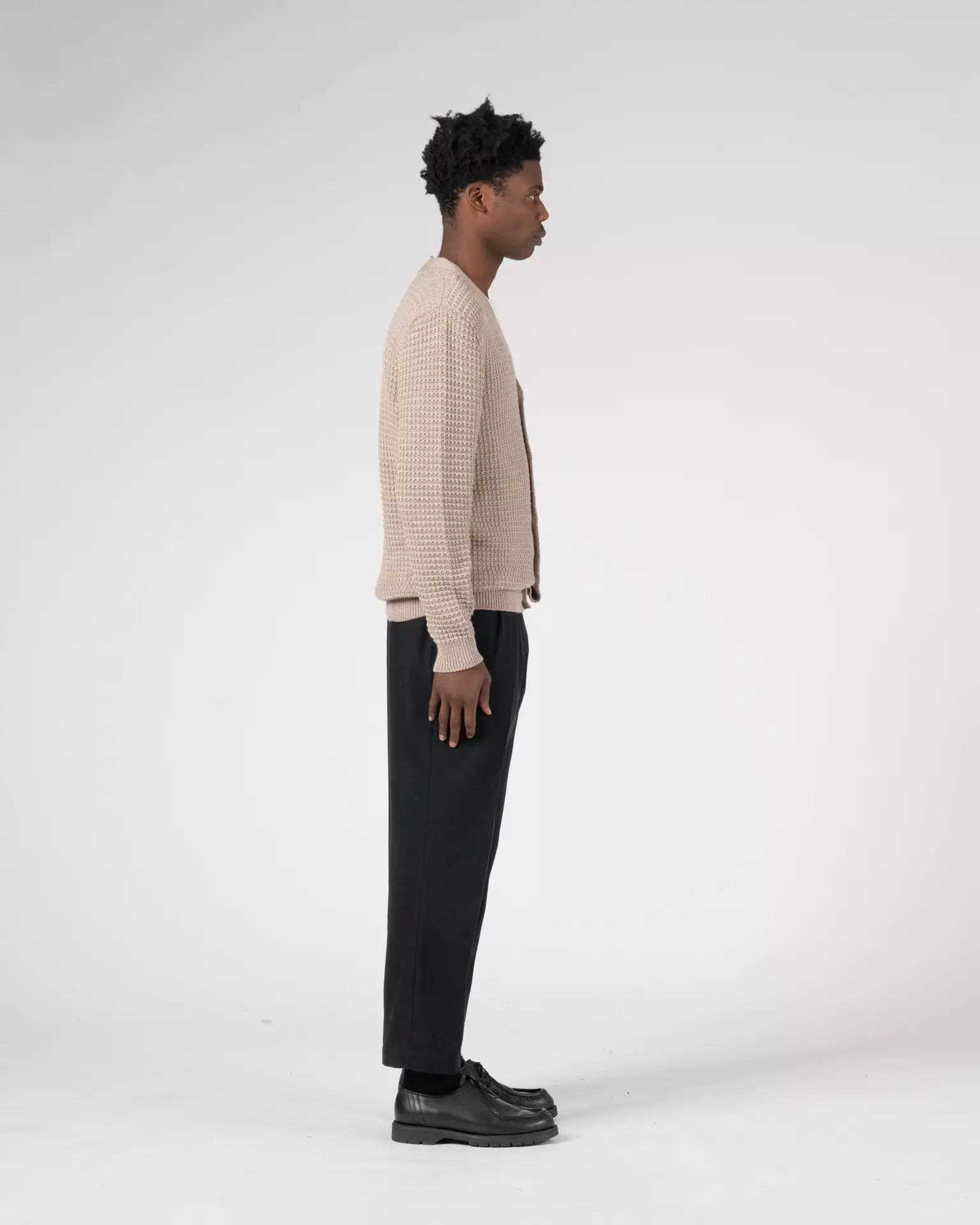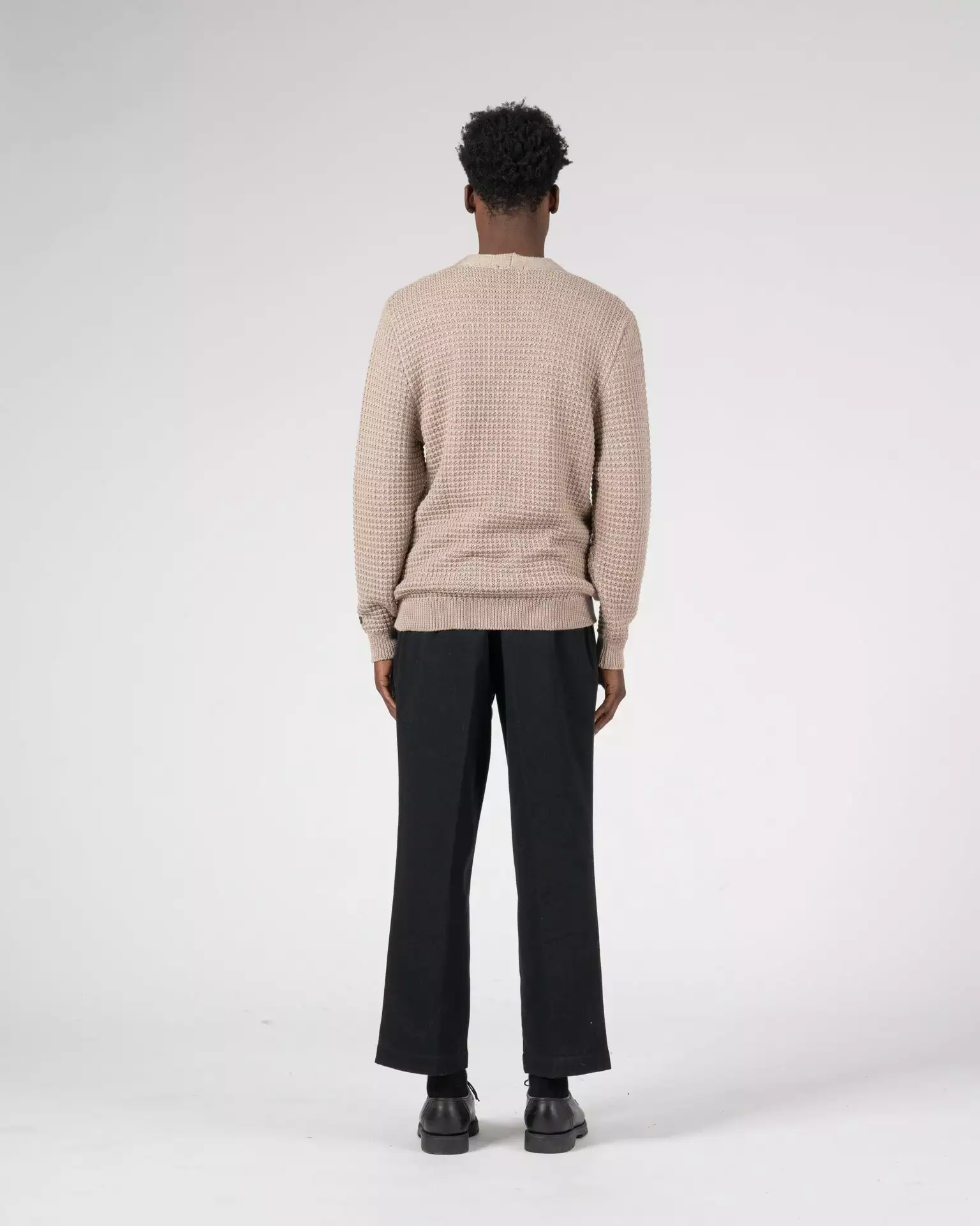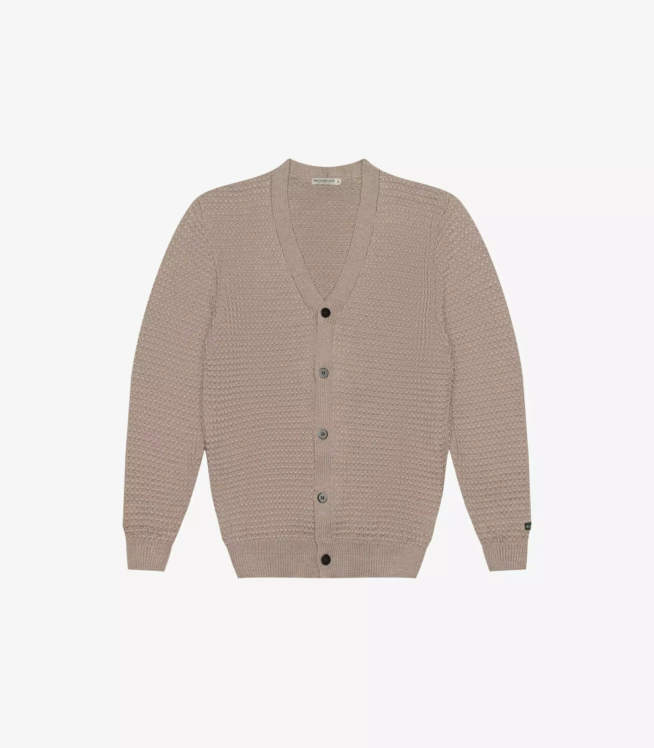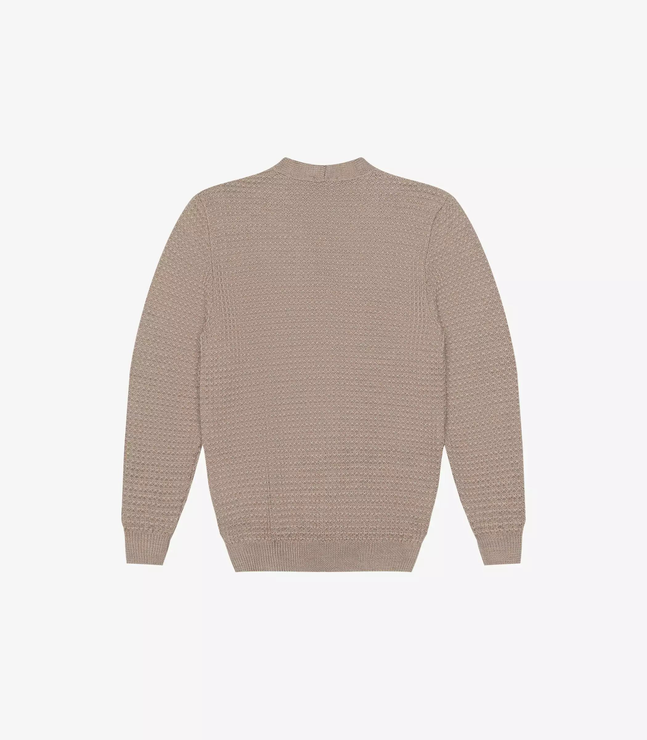Made of merino wool sourced from Italy. Merino is a premium yarn known for retaining shape, air and warmth while maintaining high elasticity. The sweater features a button front and Knickerbocker label sewn above the rib of wearer’s left sleeve.