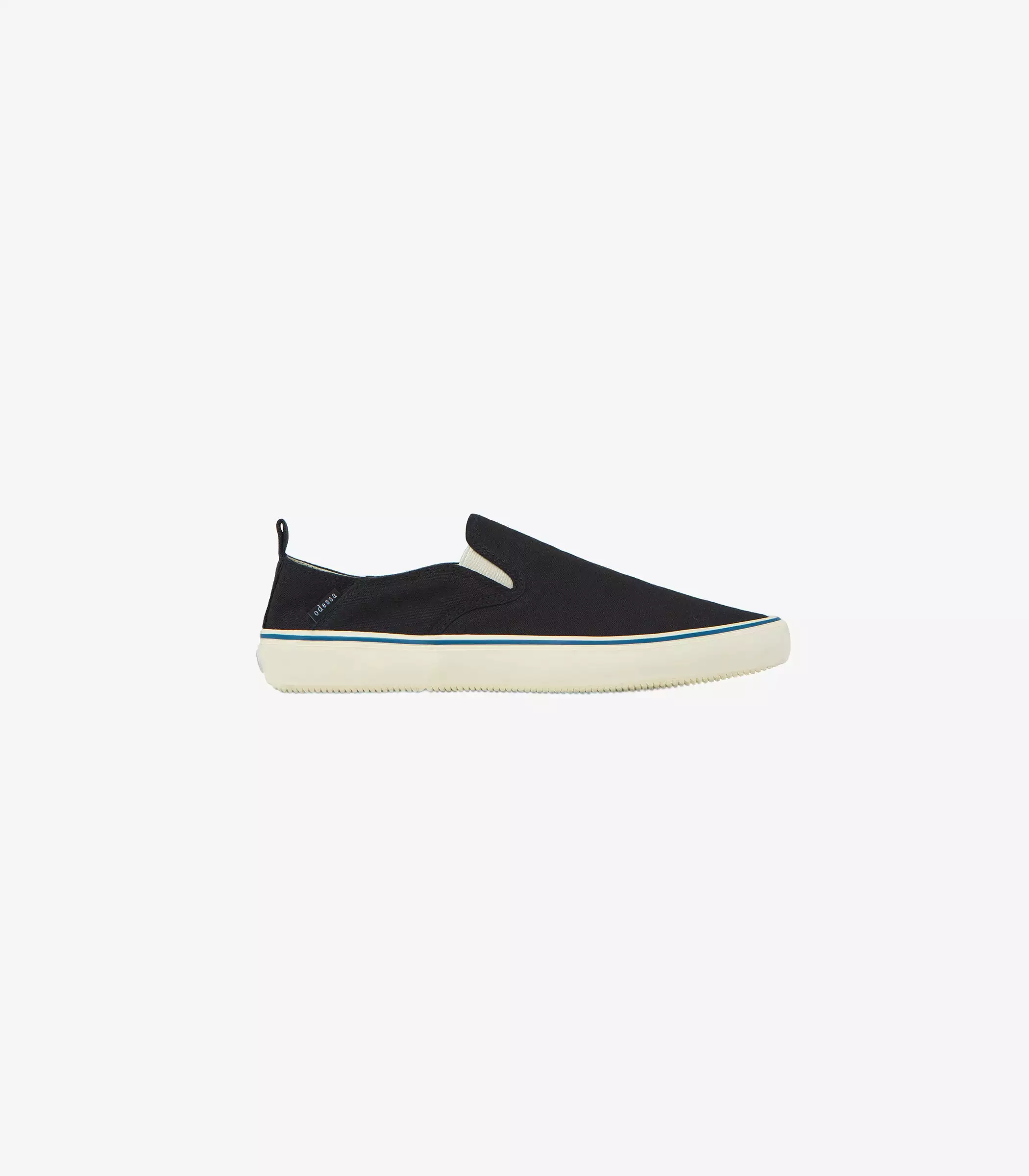 Vulcanized slip on sneaker in black canvas with navy blue foxing stripe and ivory sole. Features rubber Sole, canvas upper, and unisex sizing.