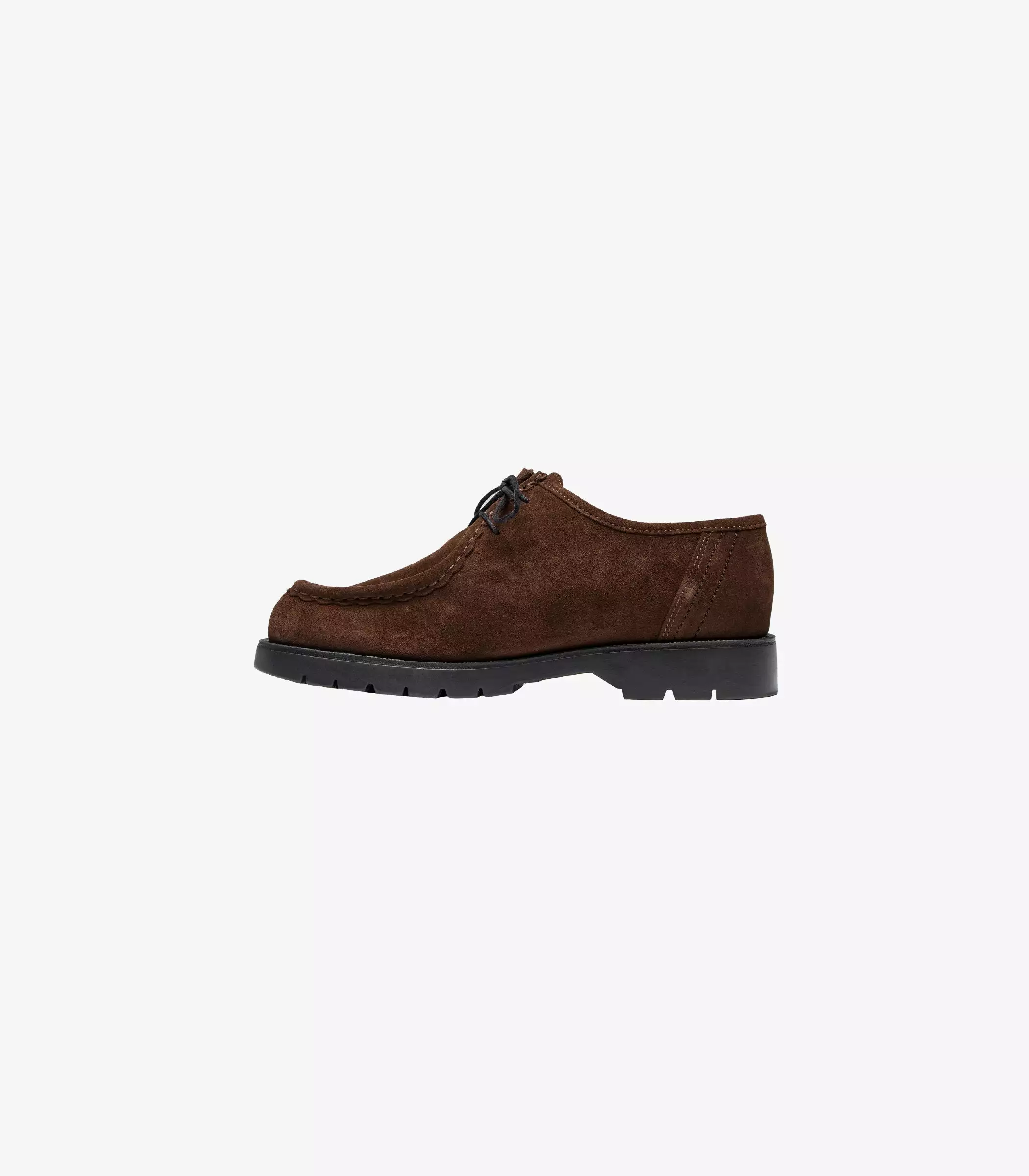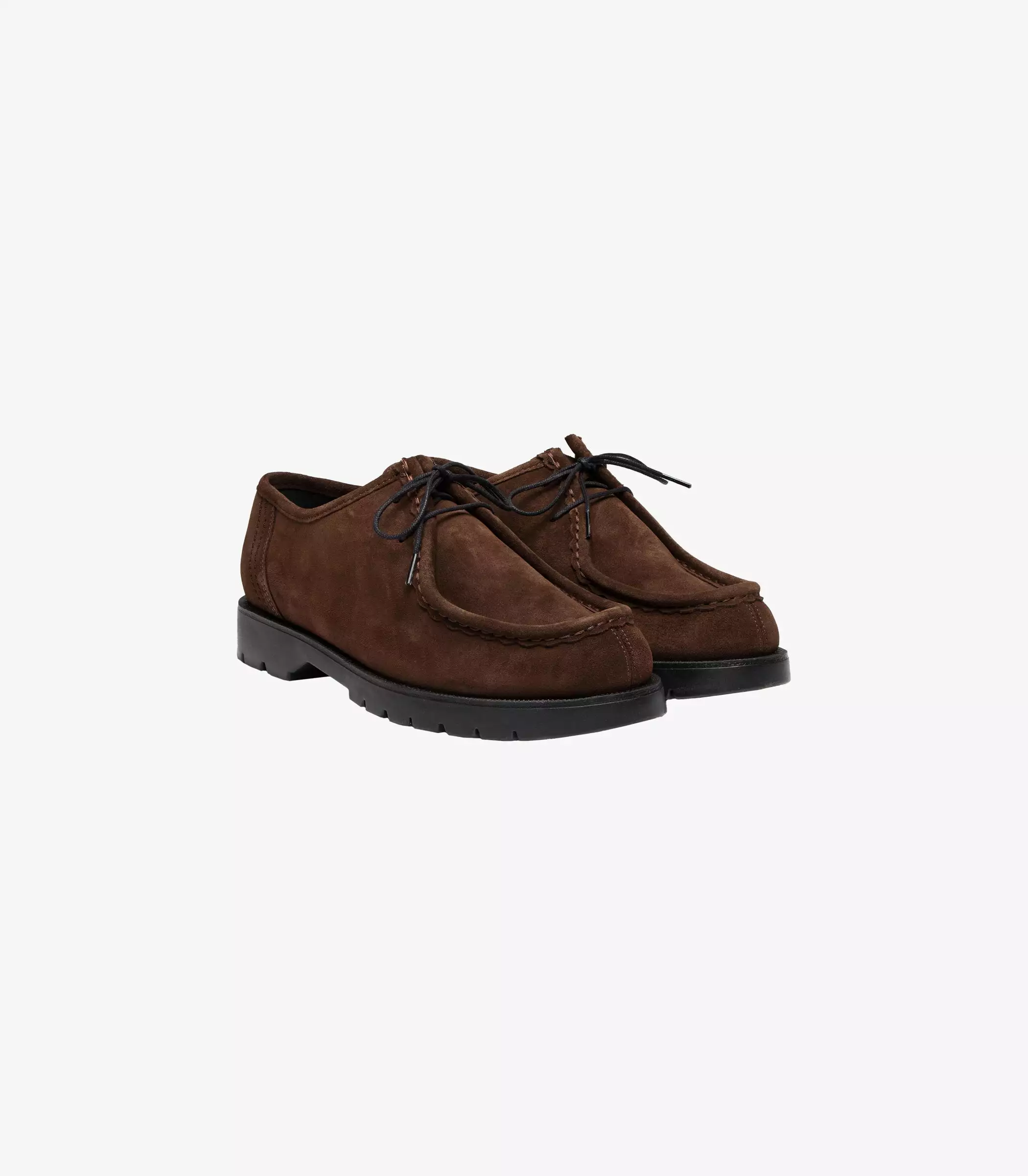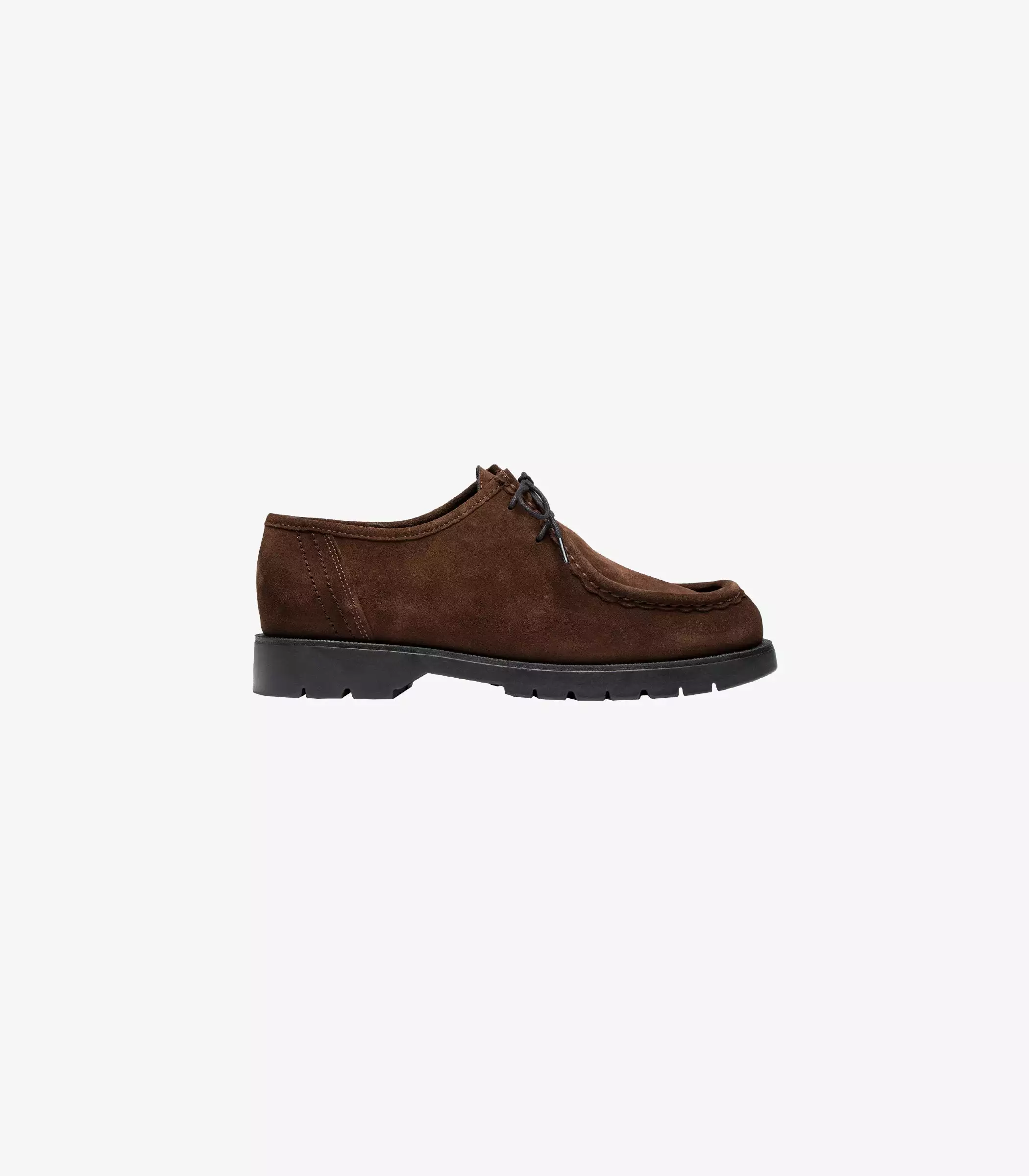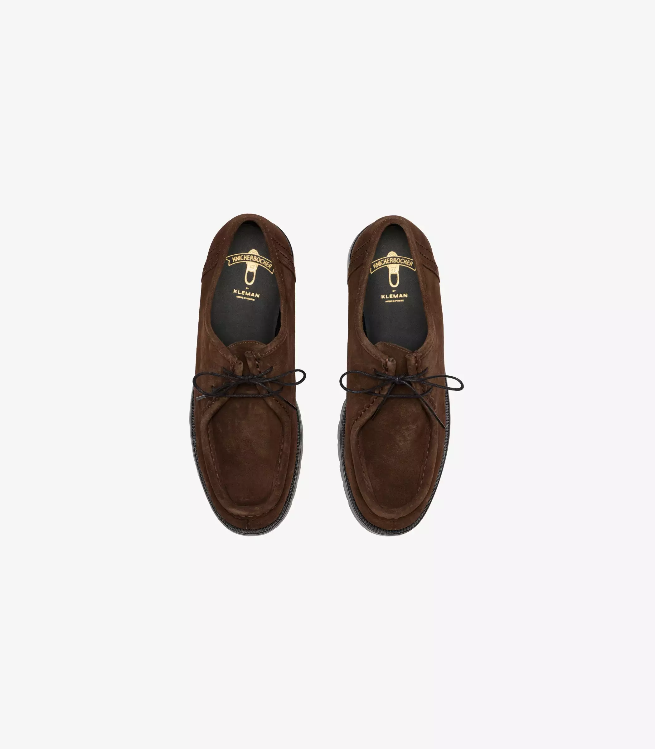 Kleman & Knickerbocker Padror Derby in Chocolate Suede. Produced in partnership with Kleman – a traditional shoe manufacturer founded in 1946 with their own factory in Anjou, France. Made for all day comfort and durability, Kleman originally produced workwear styles for the military, postal service and firefighters. Features a leather insole, suede leather upper & natural rubber outsole. We recommend Huberd’s Shoe Grease for weather-proofing your shoes. Fit is true to size.
