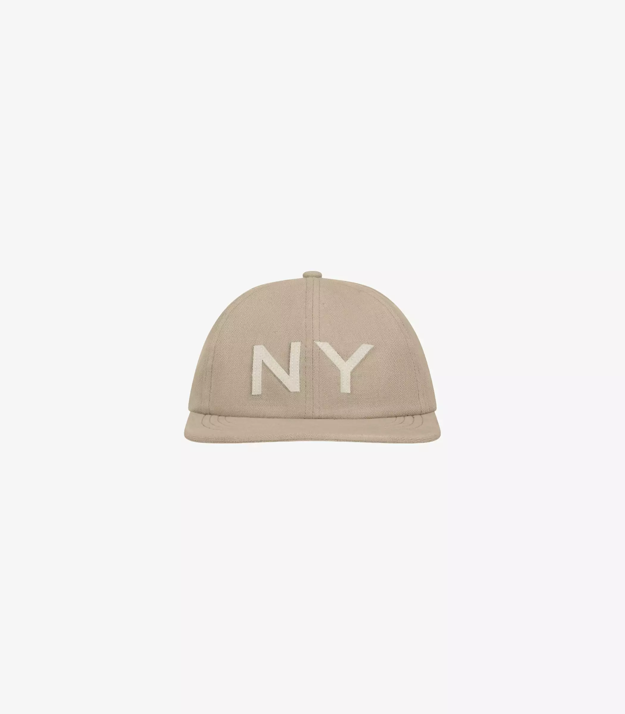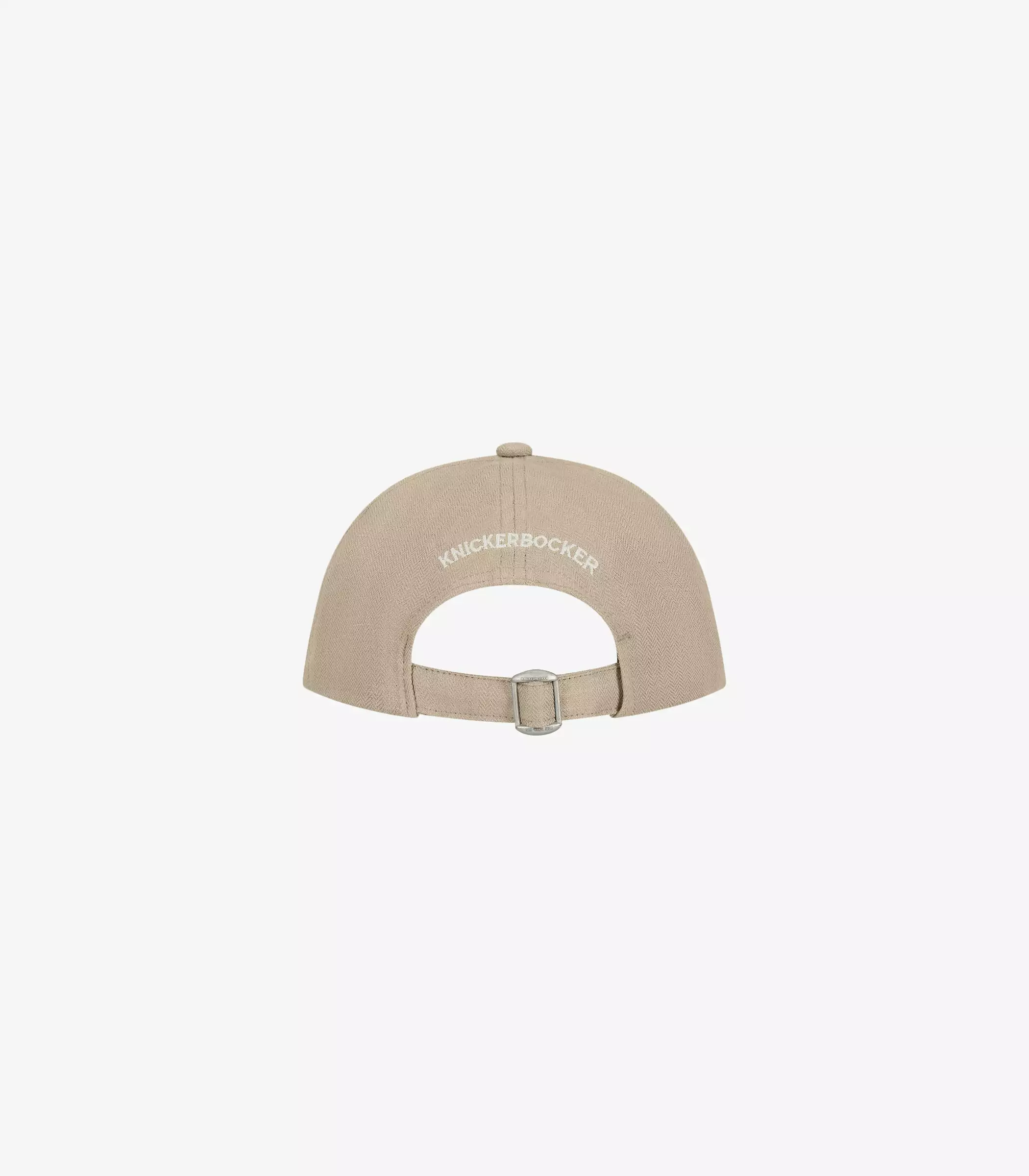 The Pines Ball Cap in khaki. Made of a cotton and linen blend fabric sourced from Italy. Felt applique N.Y. on front panel with Knickerbocker embroidery on back. Adjustable back strap with Knickerbocker branded tin slider. Un-structured and low profile silhouette. Features our custom brim insert, which provides structure and greater flexibility to better fit the contour of the wearer.