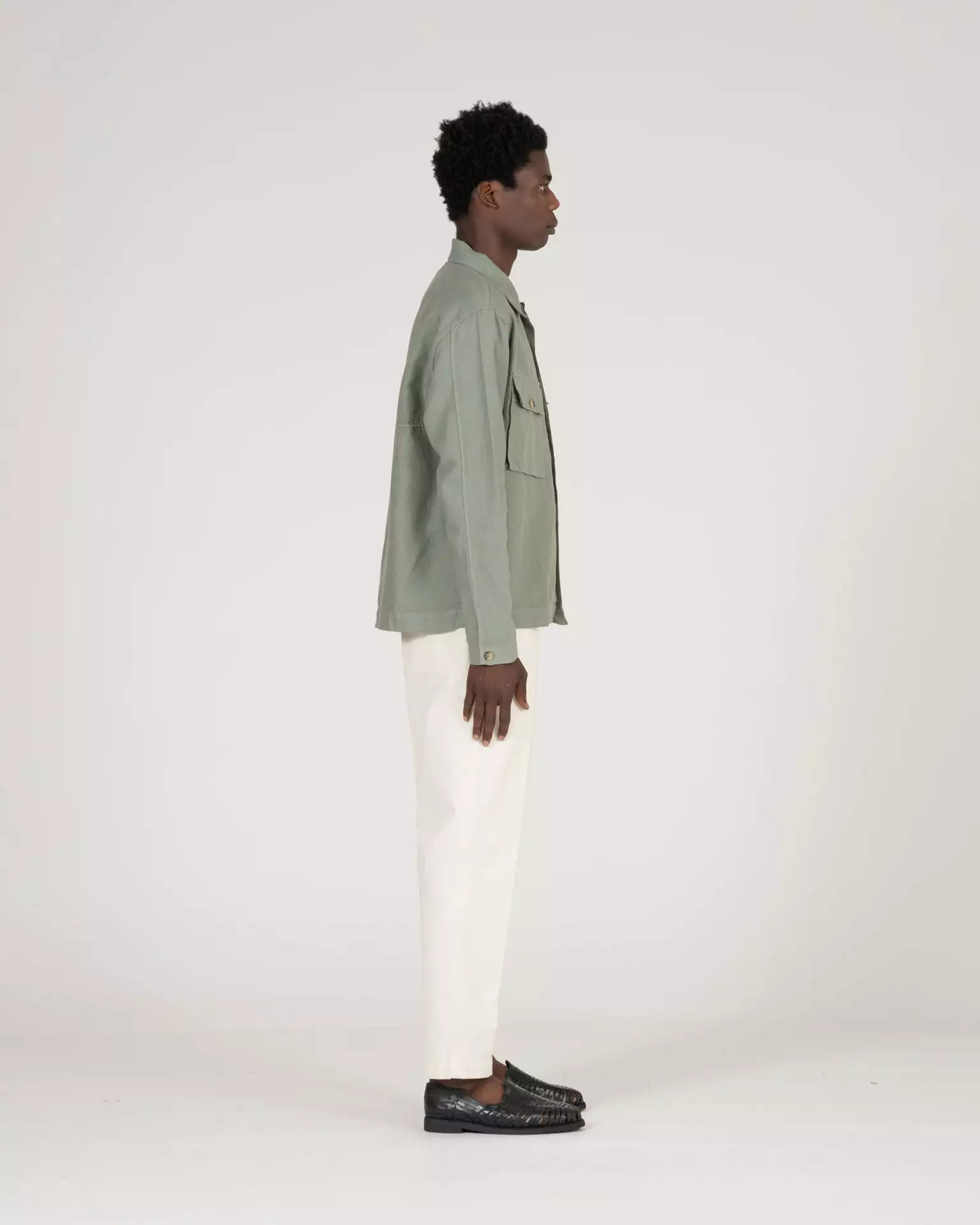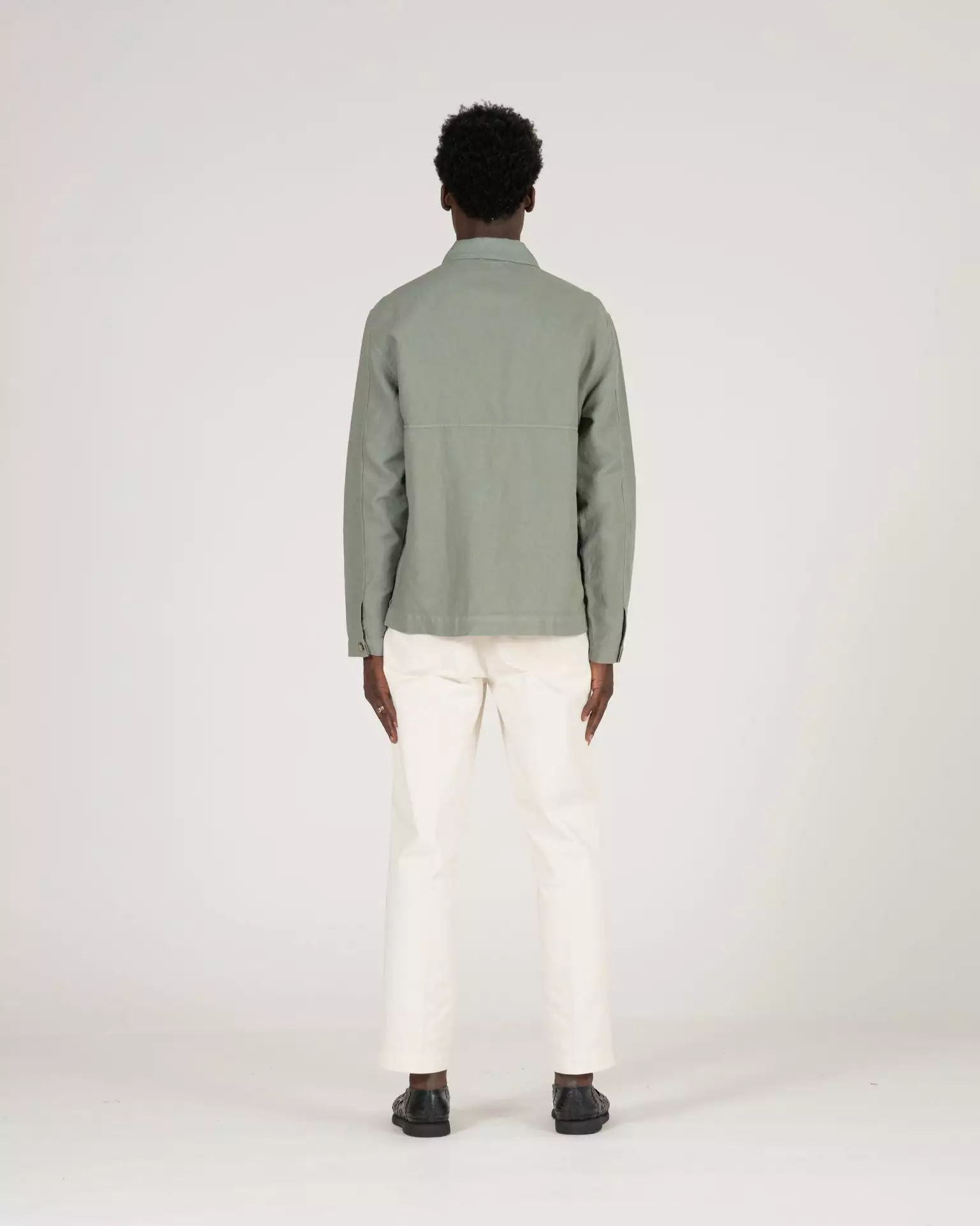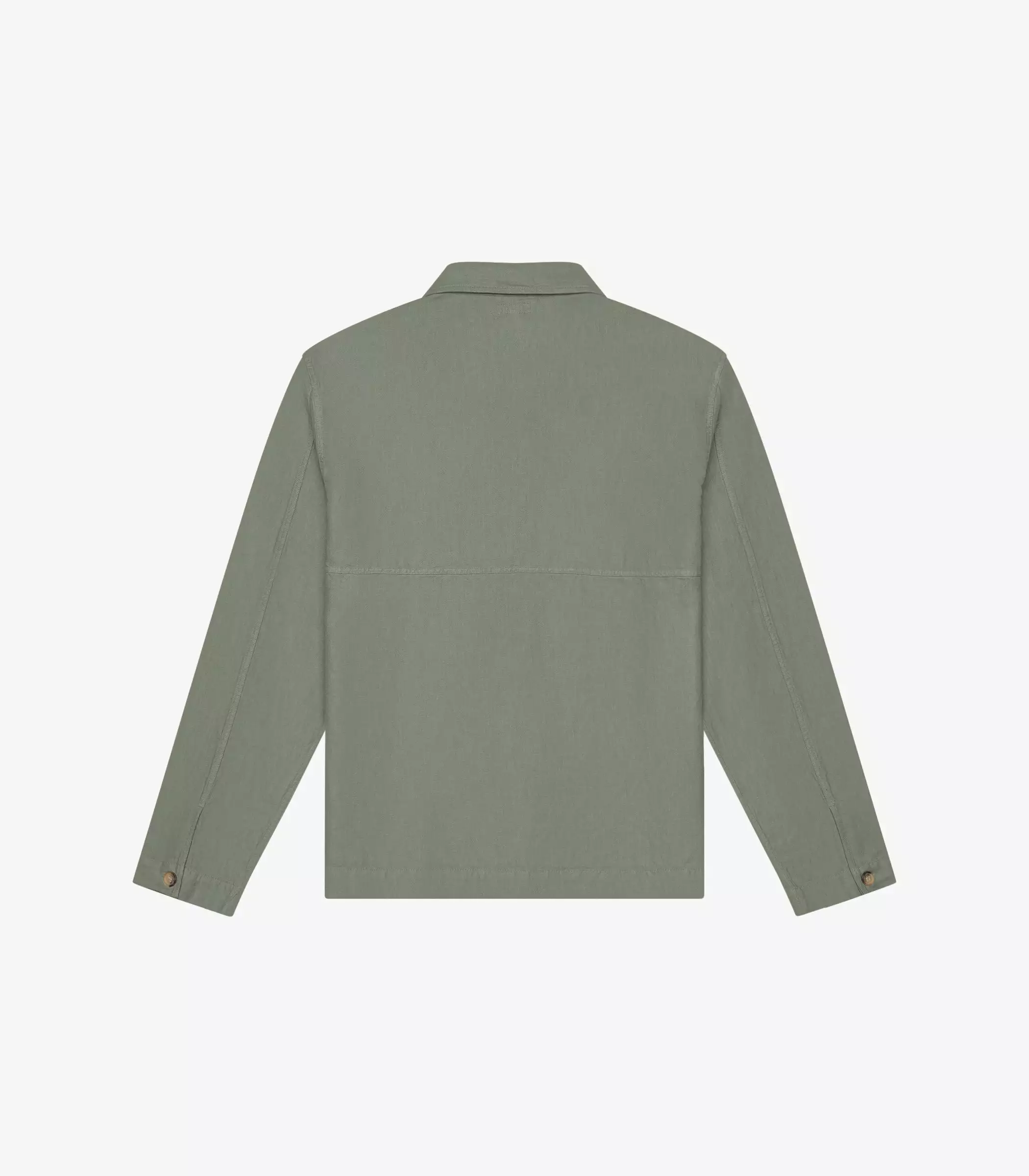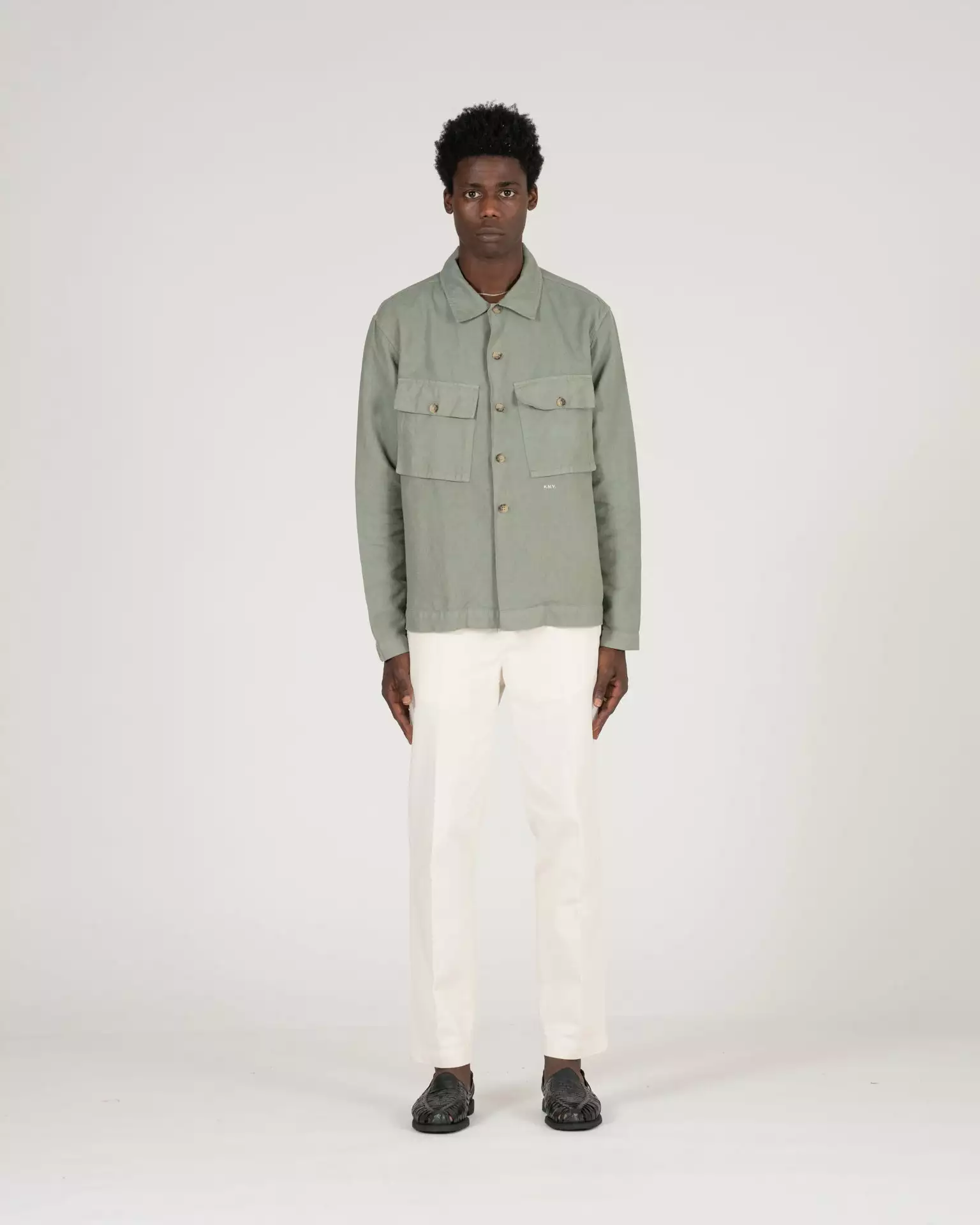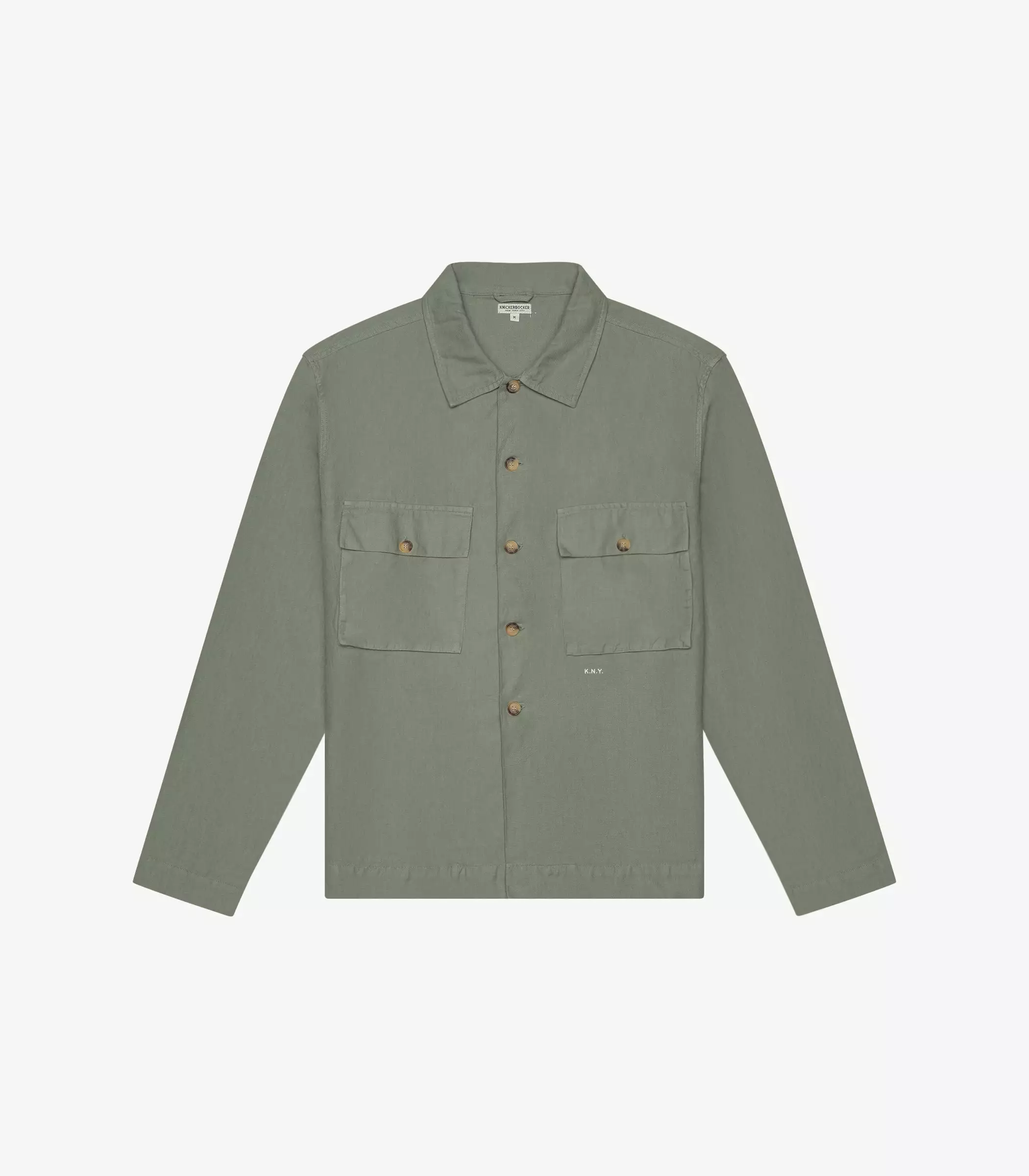 The Pines Shirt in Green. Made of a custom developed cotton and linen twill from Italy. Features horn buttons and K.N.Y. embroidered monogram.