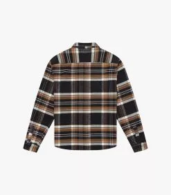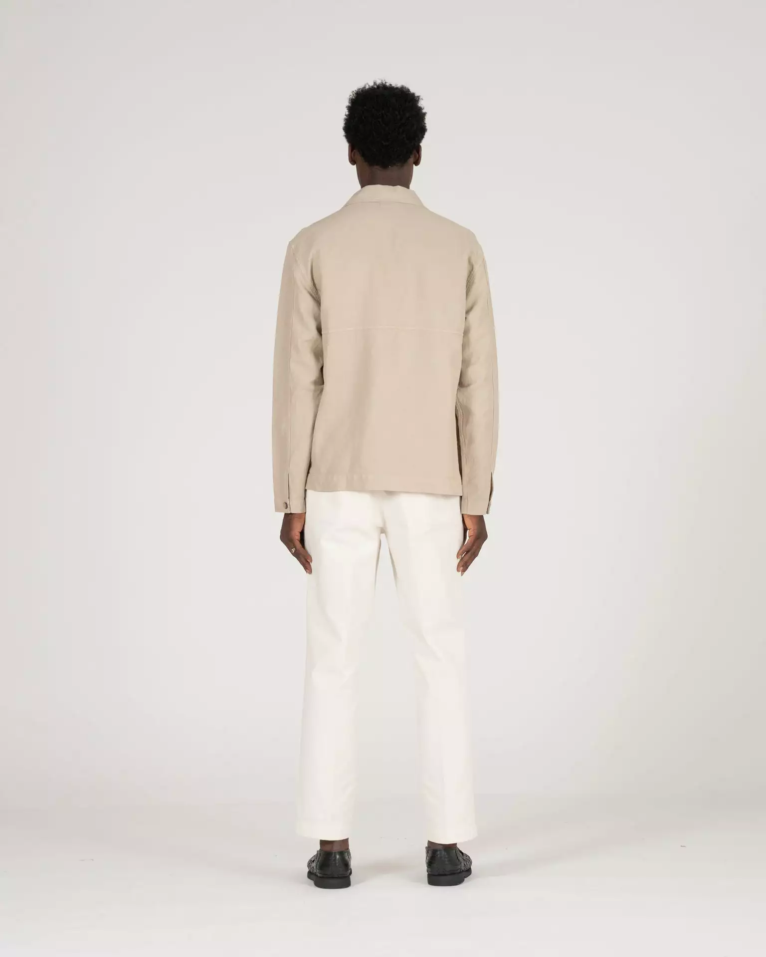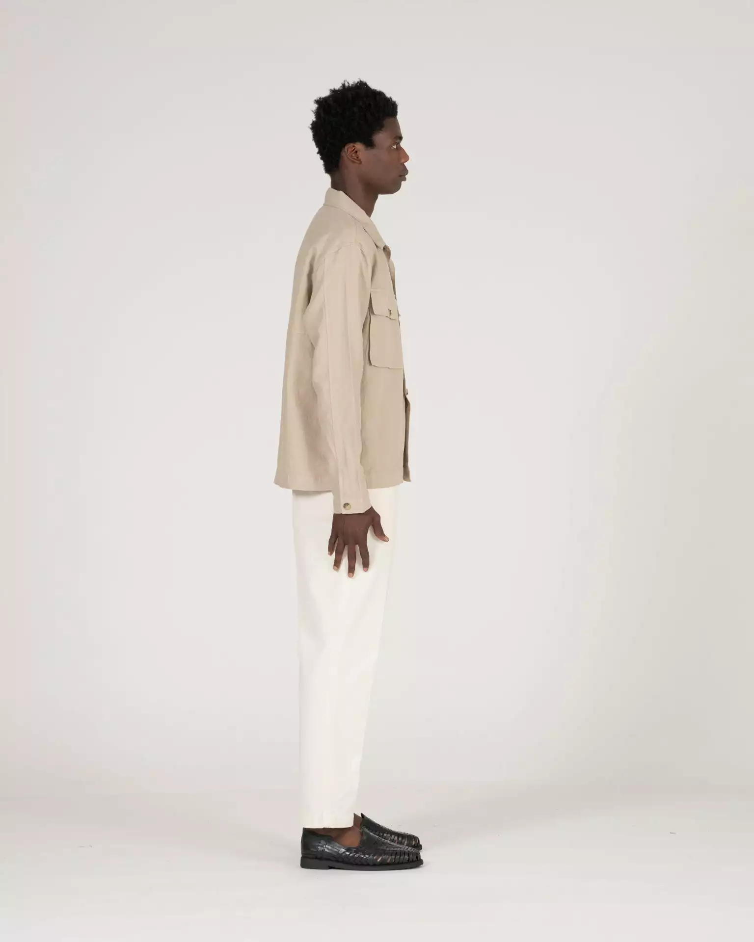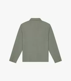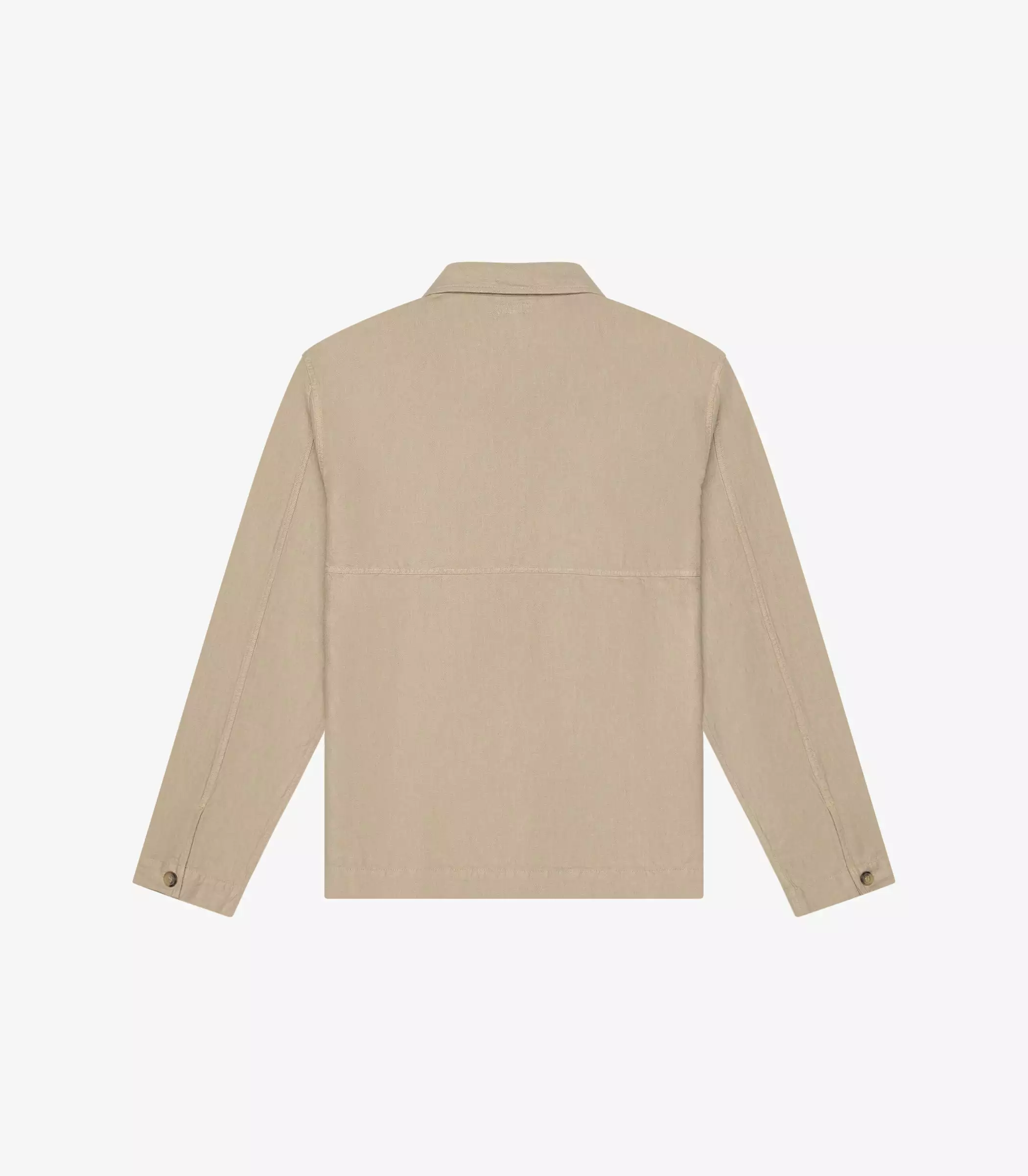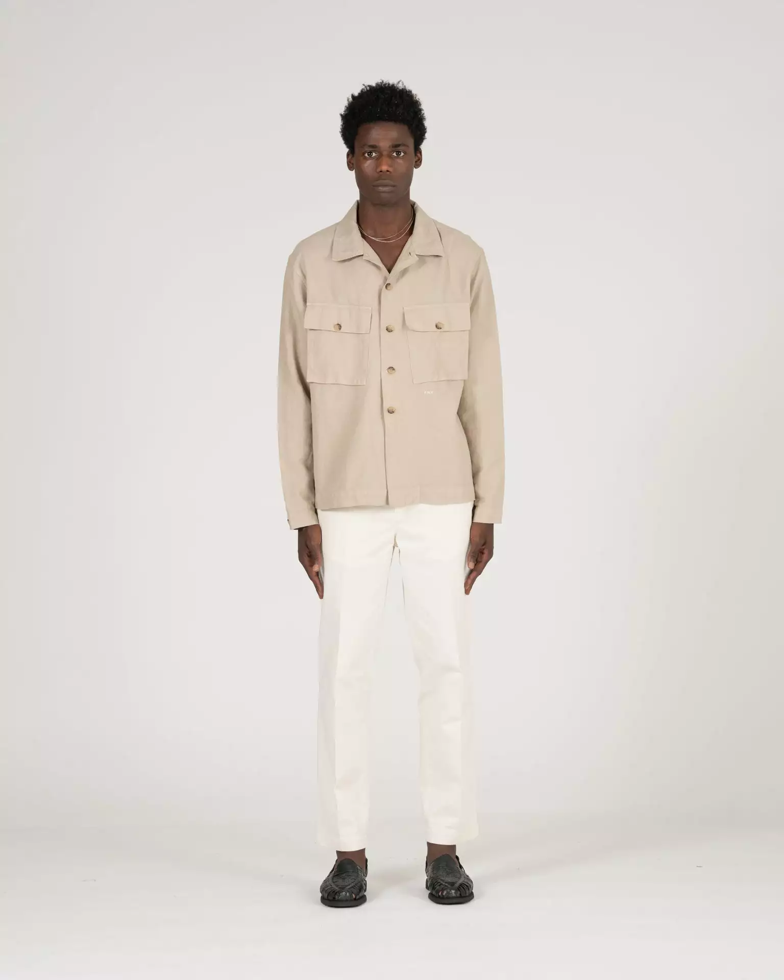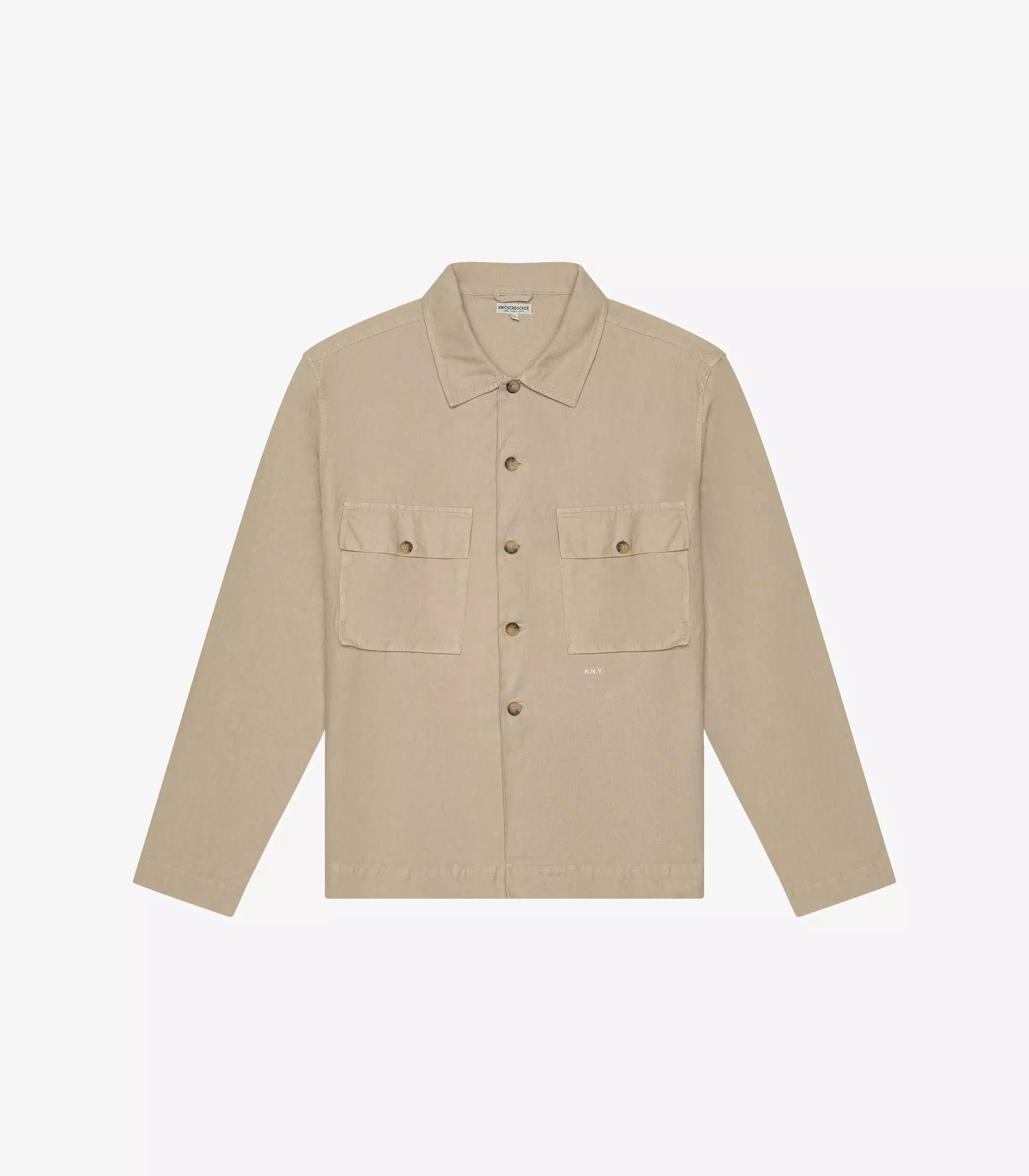 The Pines Shirt in Khaki. Made of a custom developed cotton and linen twill from Italy. Features horn buttons and K.N.Y. embroidered monogram.