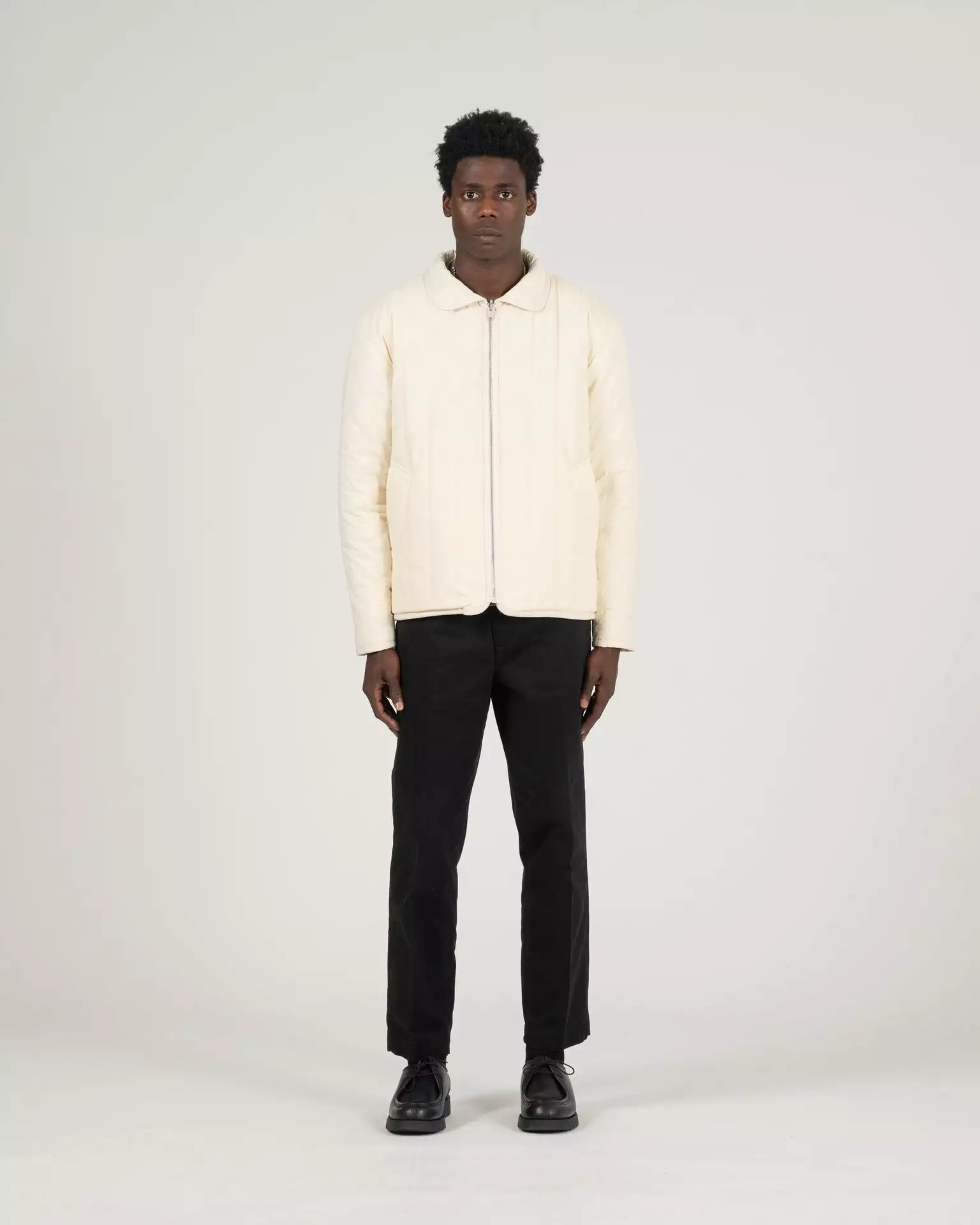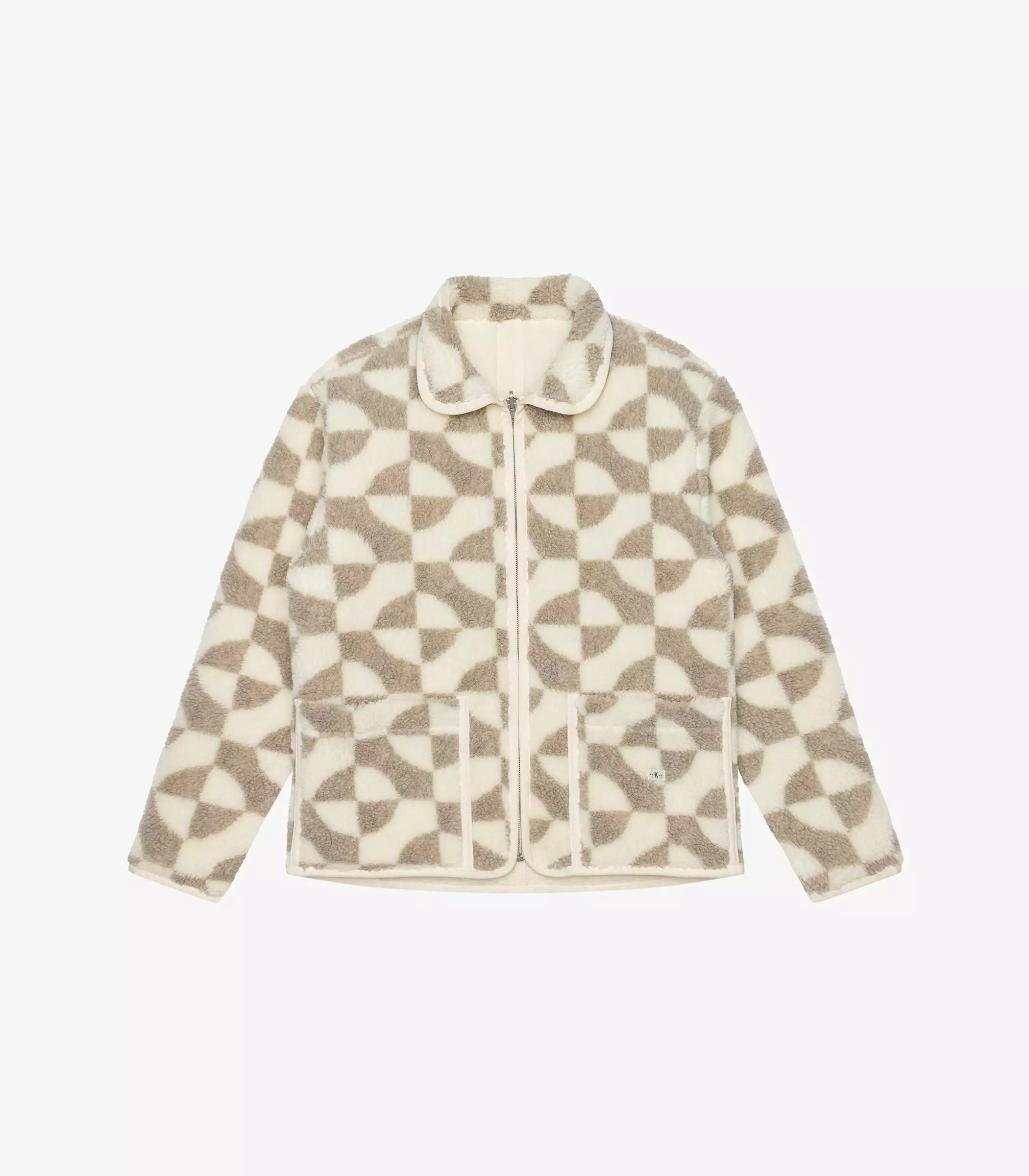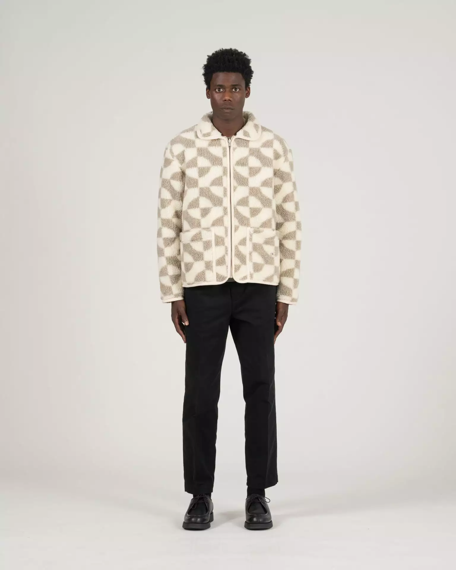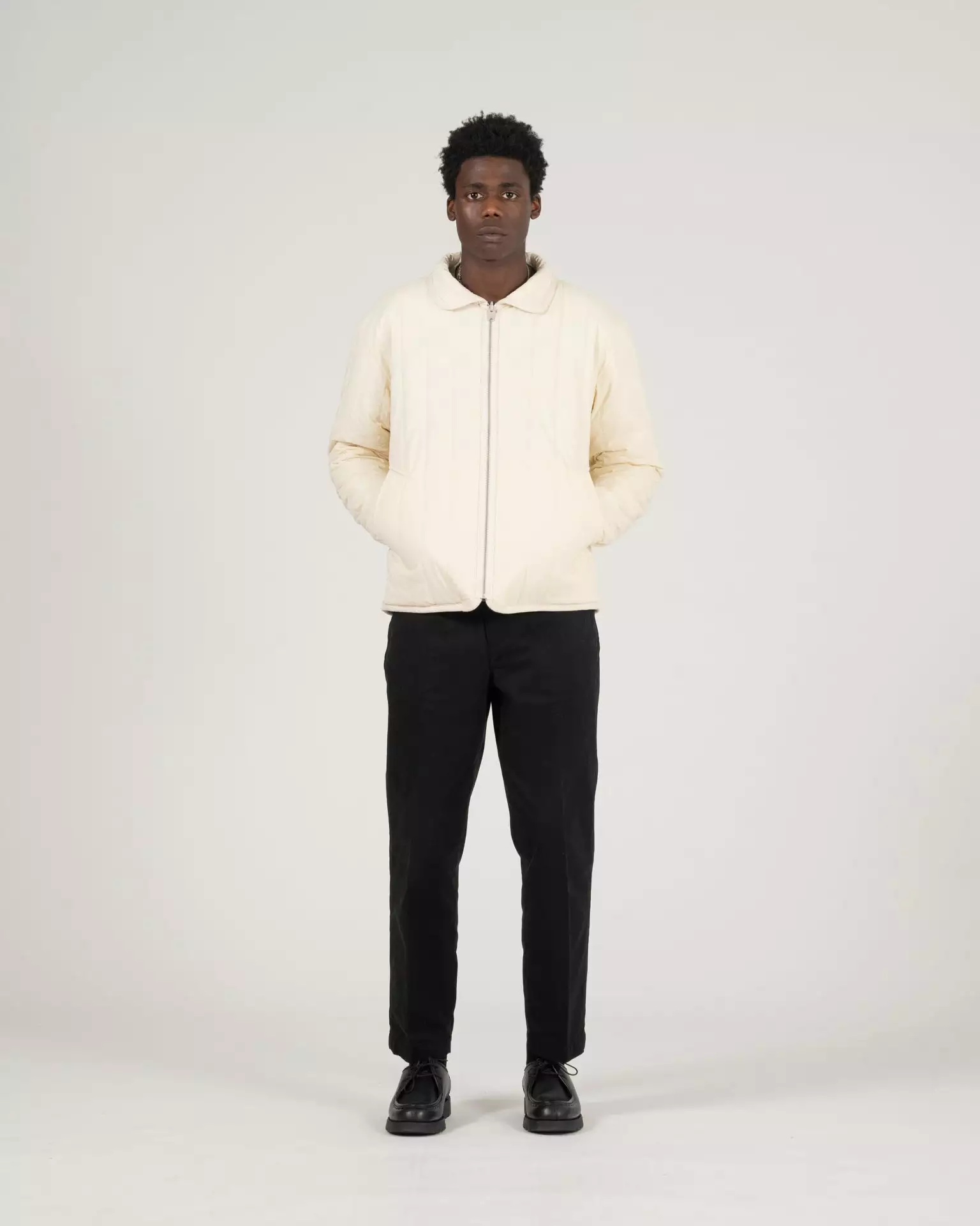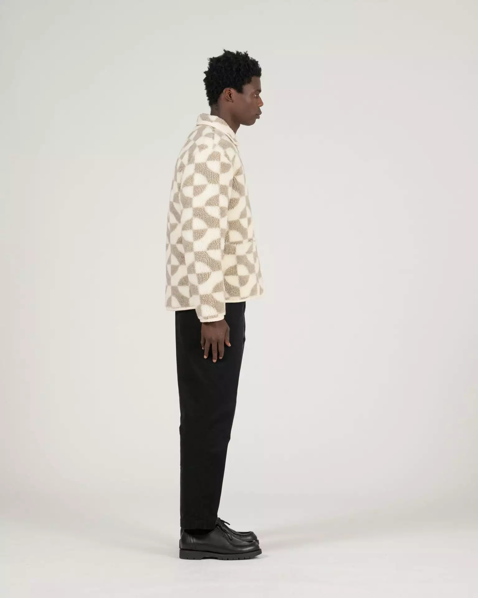 The Reverse Century Jacket in natural. The shell is a custom made pile fleece from Italy. The the reverse is a light quilted PFC free, water repellant krinkle cotton and poly blend from the well known technical Italian mill, Olmetex. Features a reversible Talon zipper and signature “K” label on pocket.