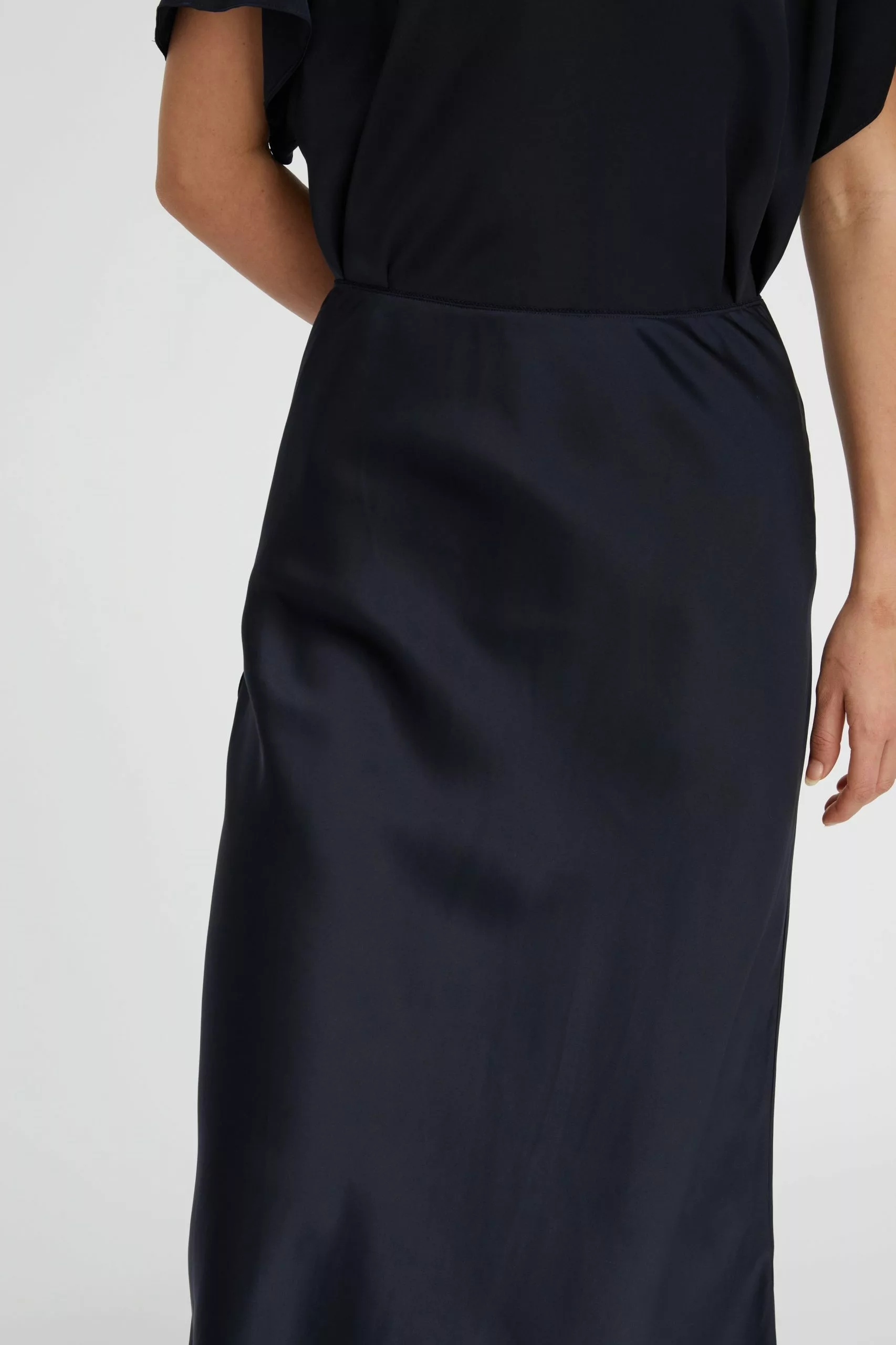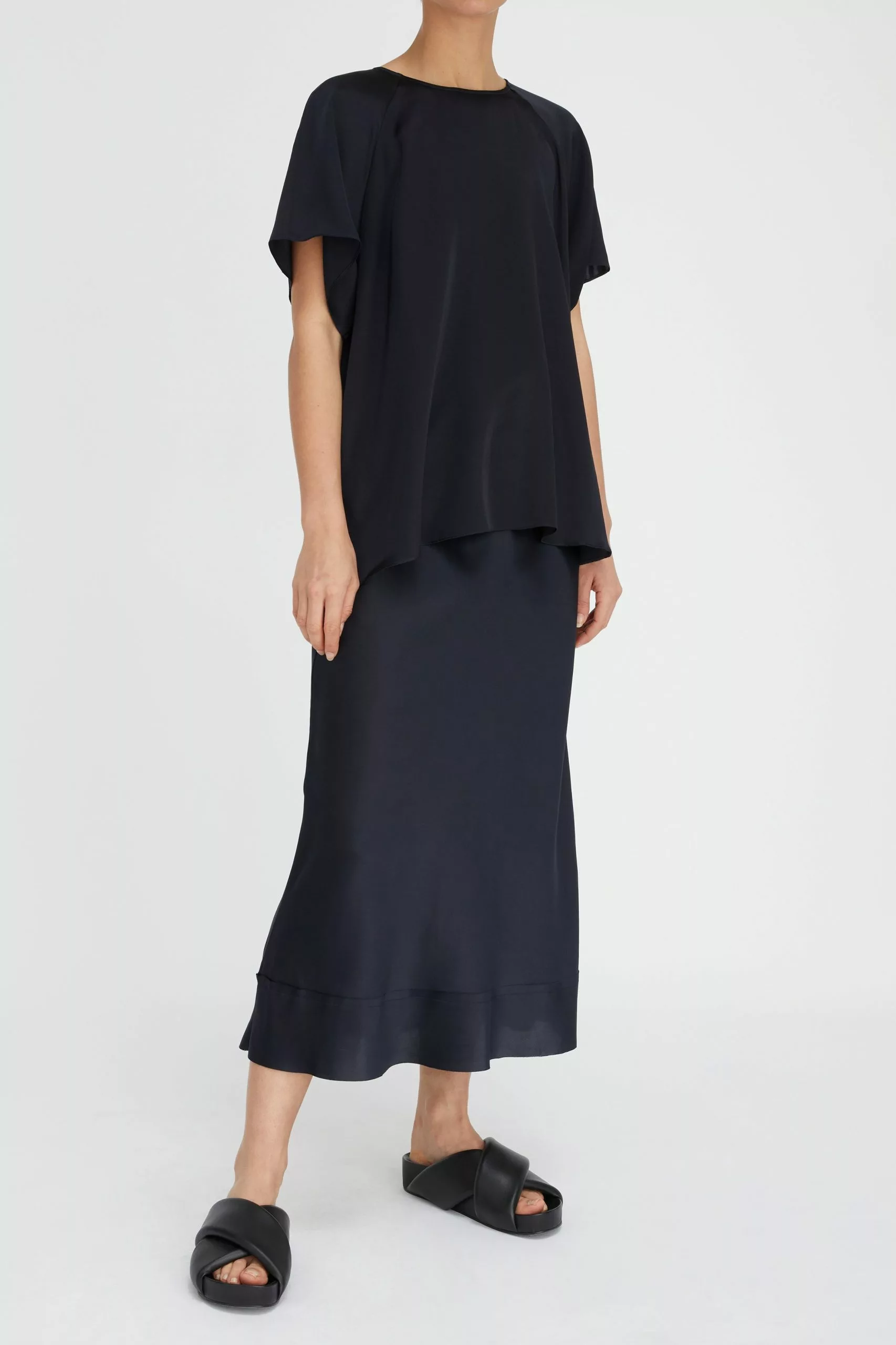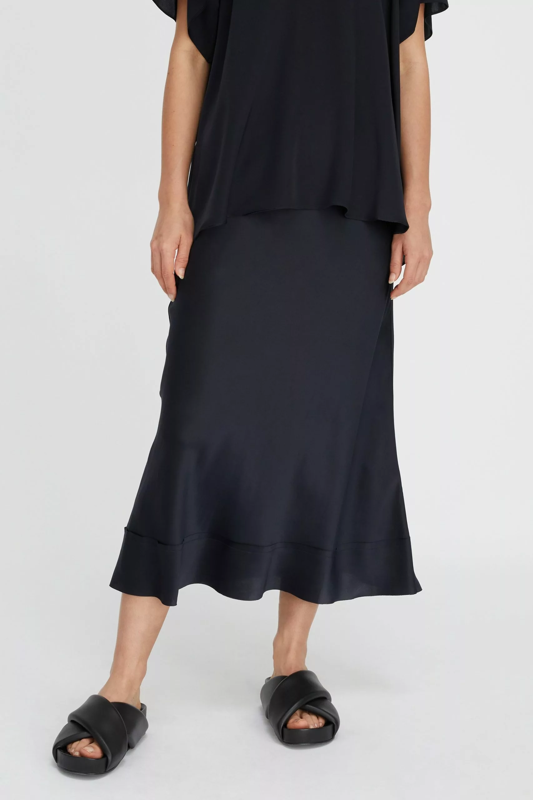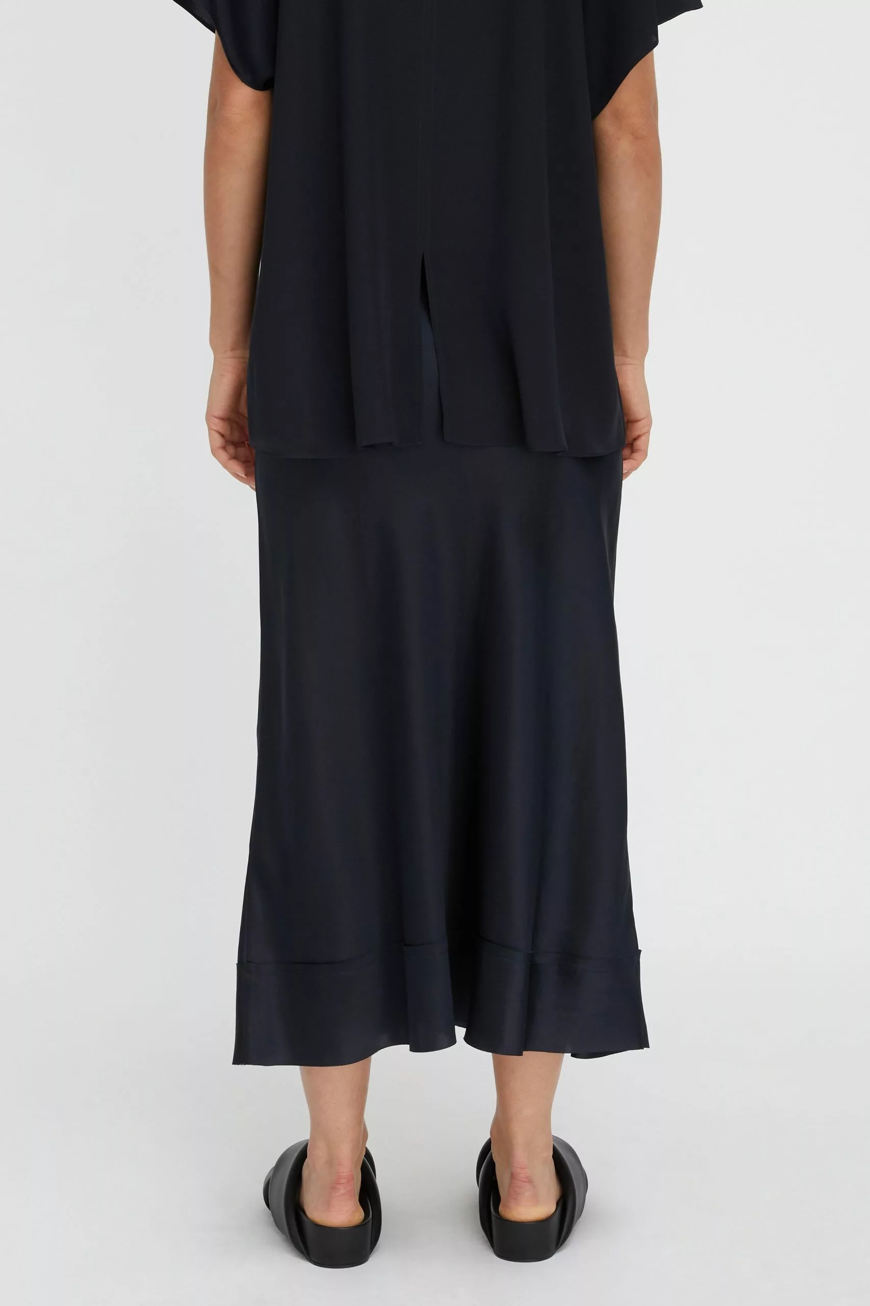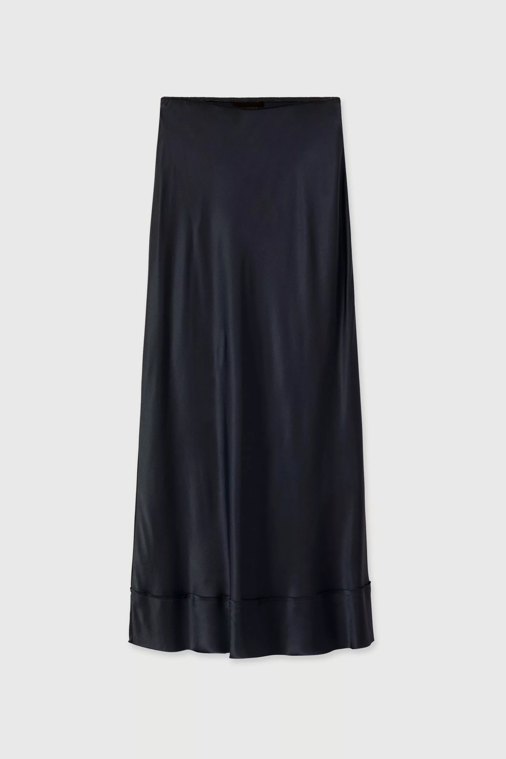 The Stella Silk Satin Skirt is available in Midnight is made from 100% silk satin. Cut on the bias for a flattering fit, this skirt has a soft, fluid, and feminine silhouette. Finished with a scalloped edge elastic waist and a raw hem, style this piece with coordinating silk satin separates or with a t.shirt for a relaxed look.