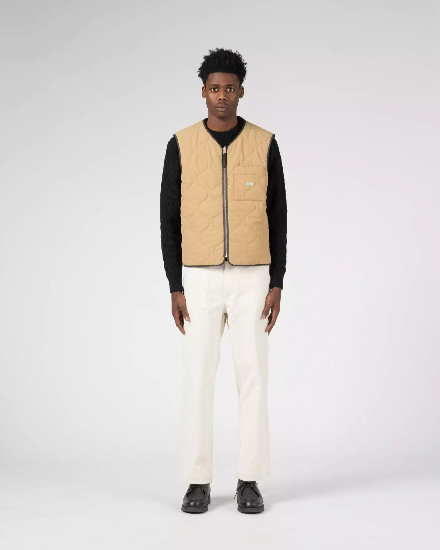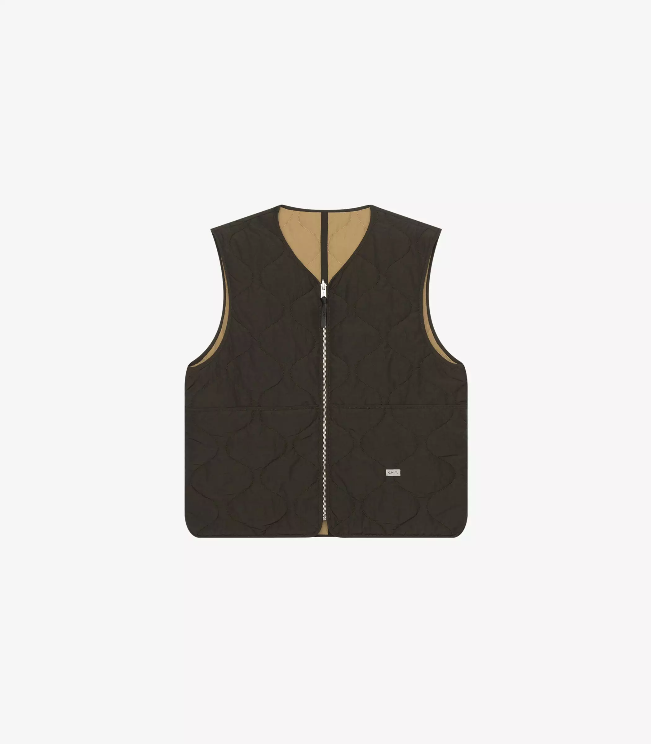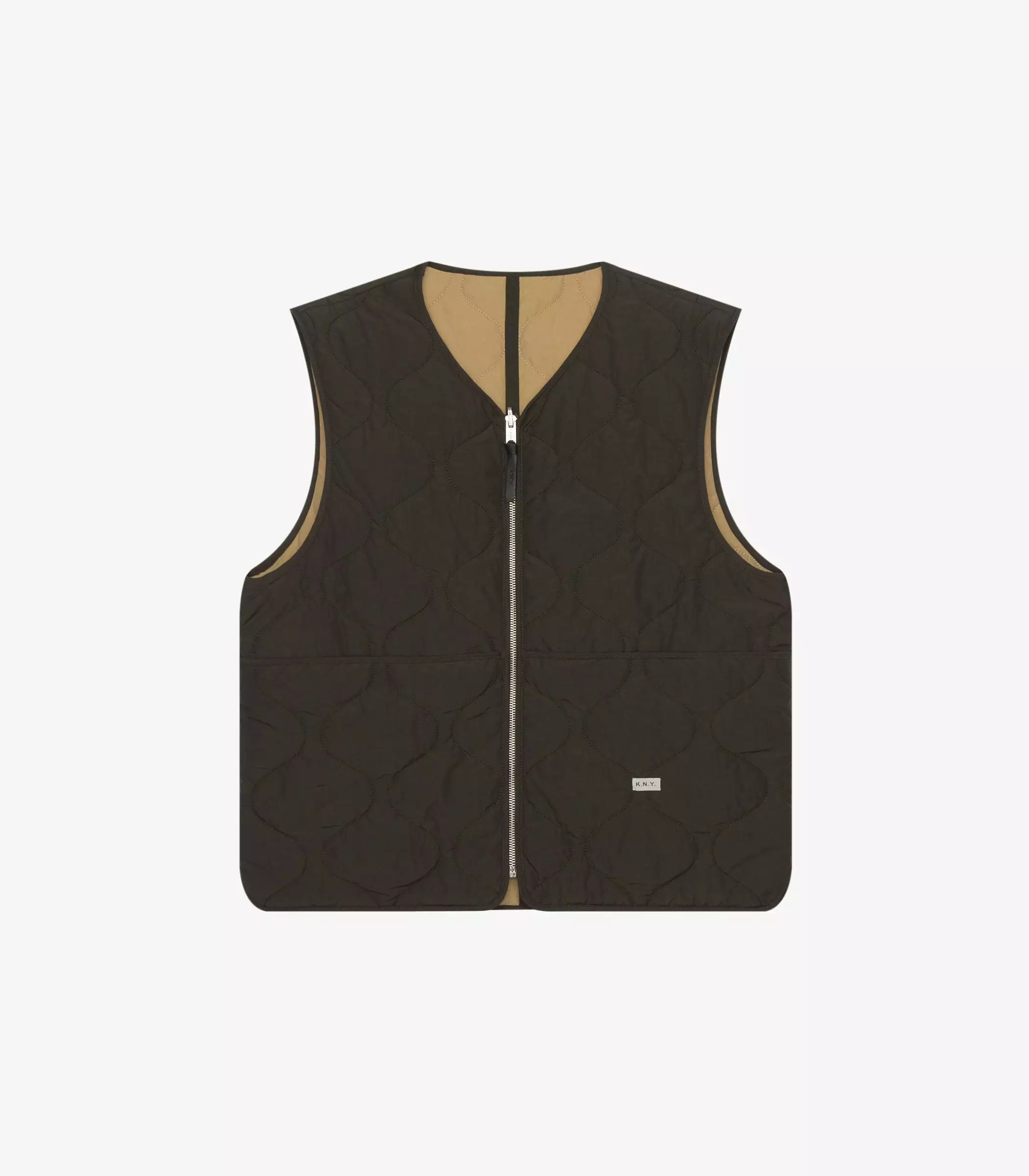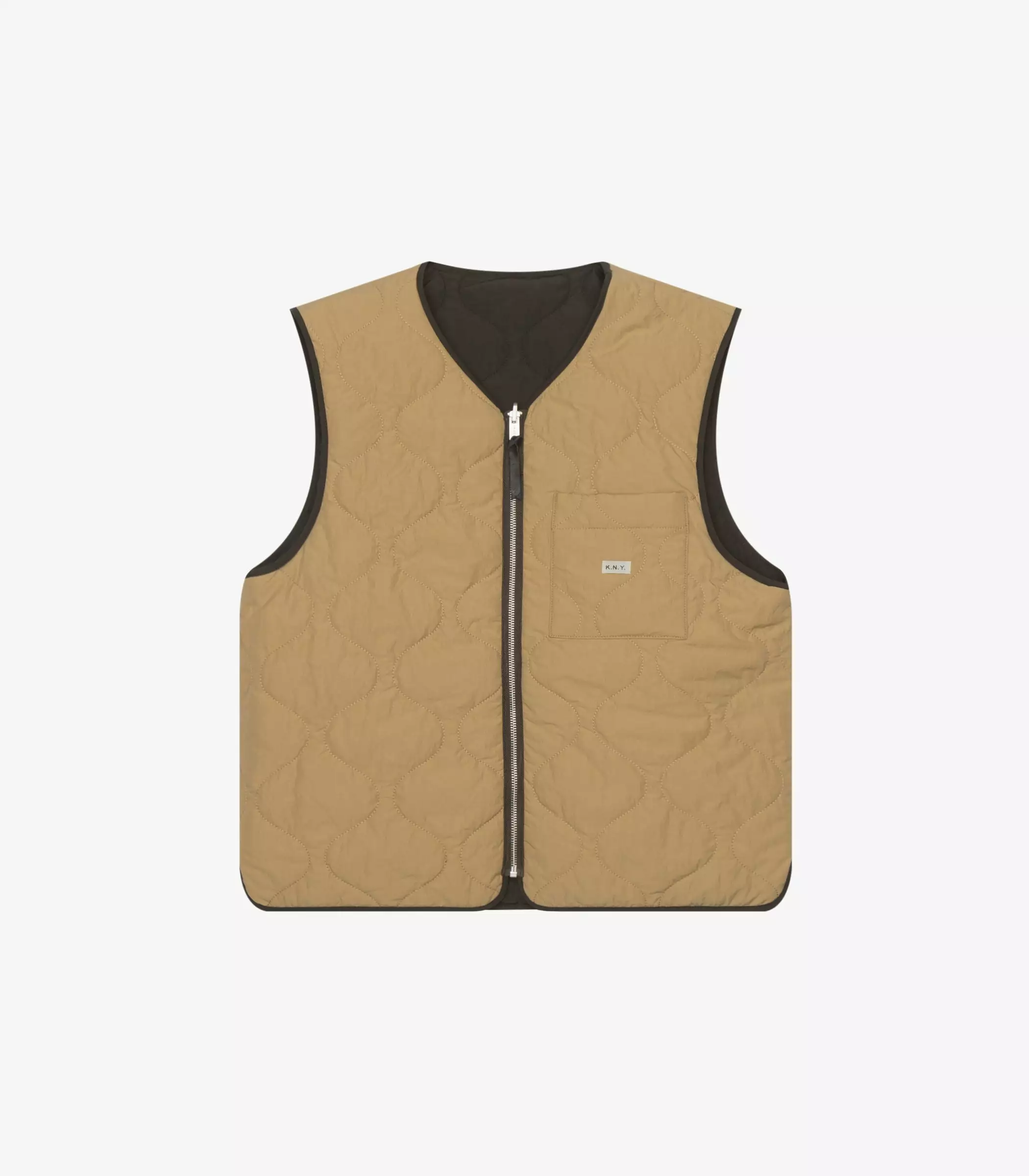 Made of a yarn dyed cotton and nylon woven sourced from the Italian mill Olmetex – technical experts in performance textiles. This fabric is water repellant and easy to care for. The fabric has been quilted with a featherless insulation, which replaces natural down, maintains warmth and regulates body temperature. The jacket is reversible featuring patch pockets on one side and a single left chest pocket on the other. Both sides of the jacket have a Knickerbocker label sewn on the left pocket.