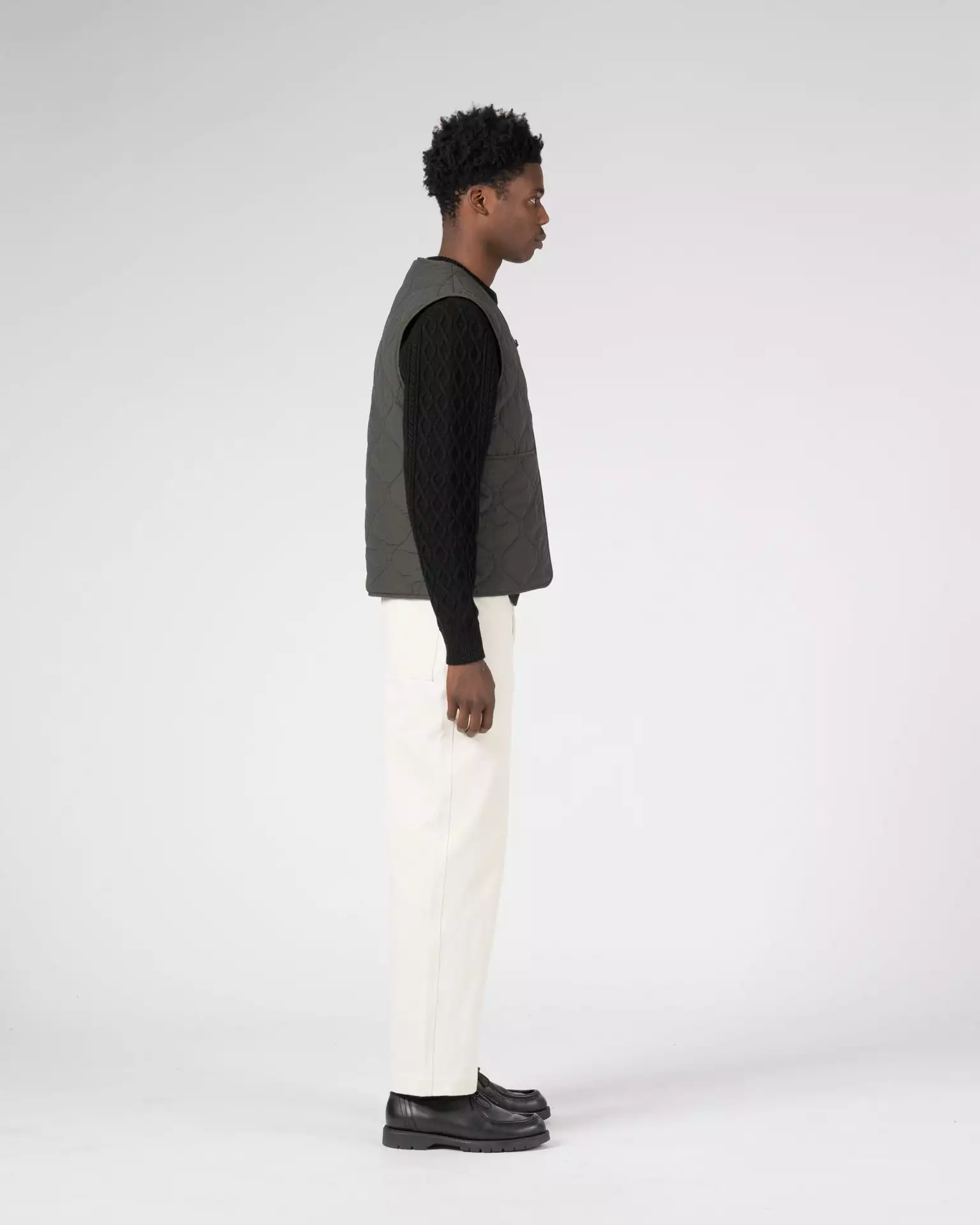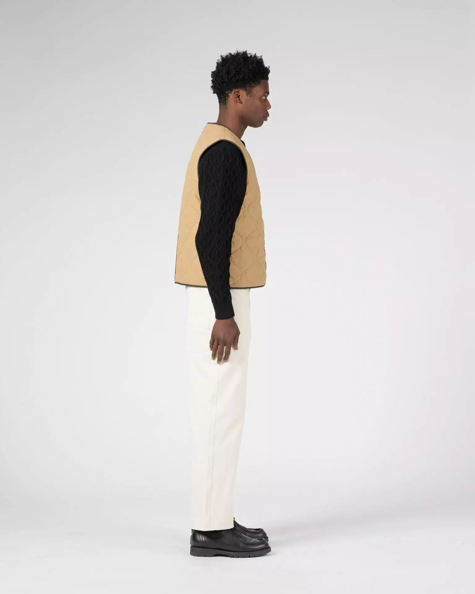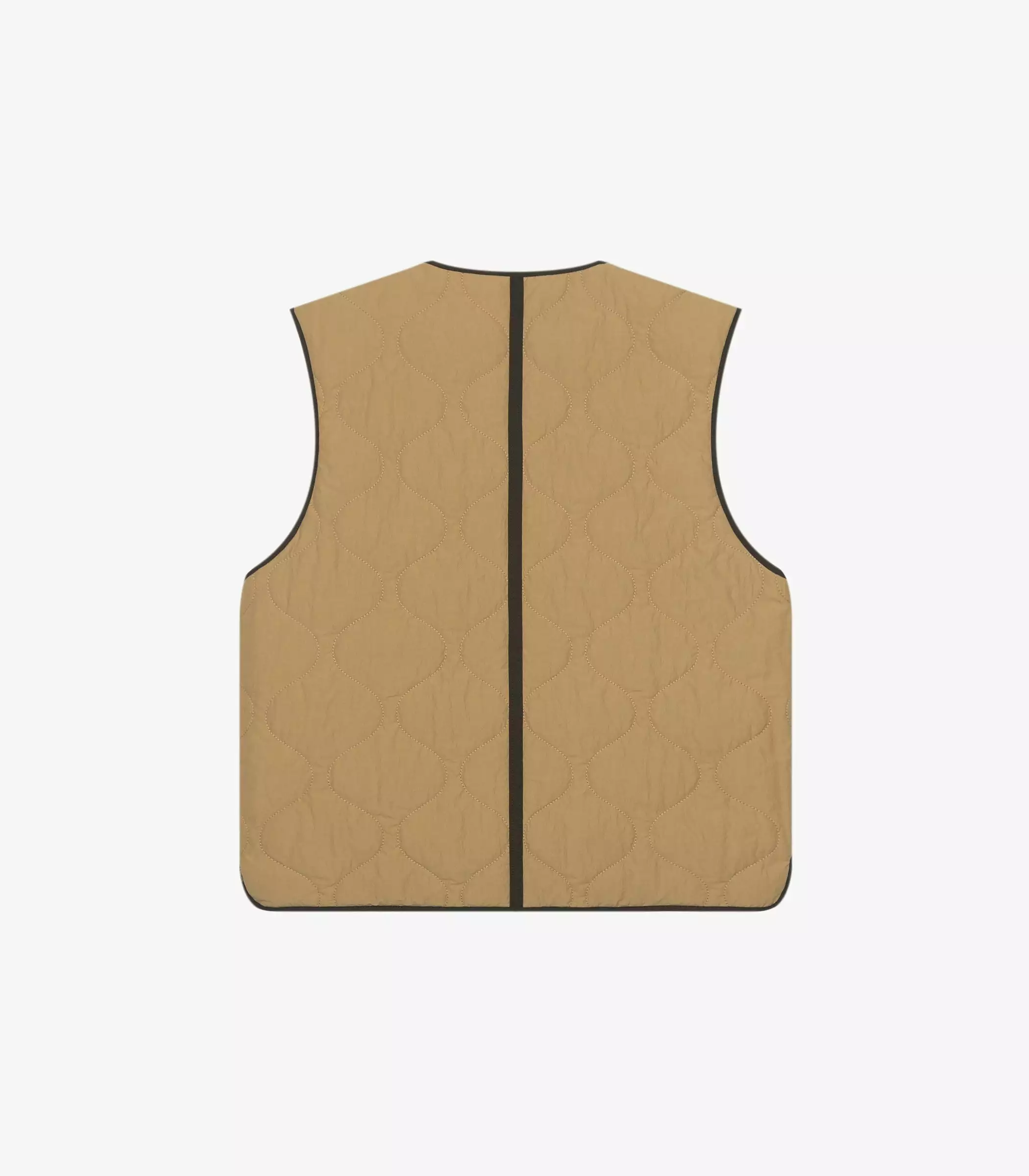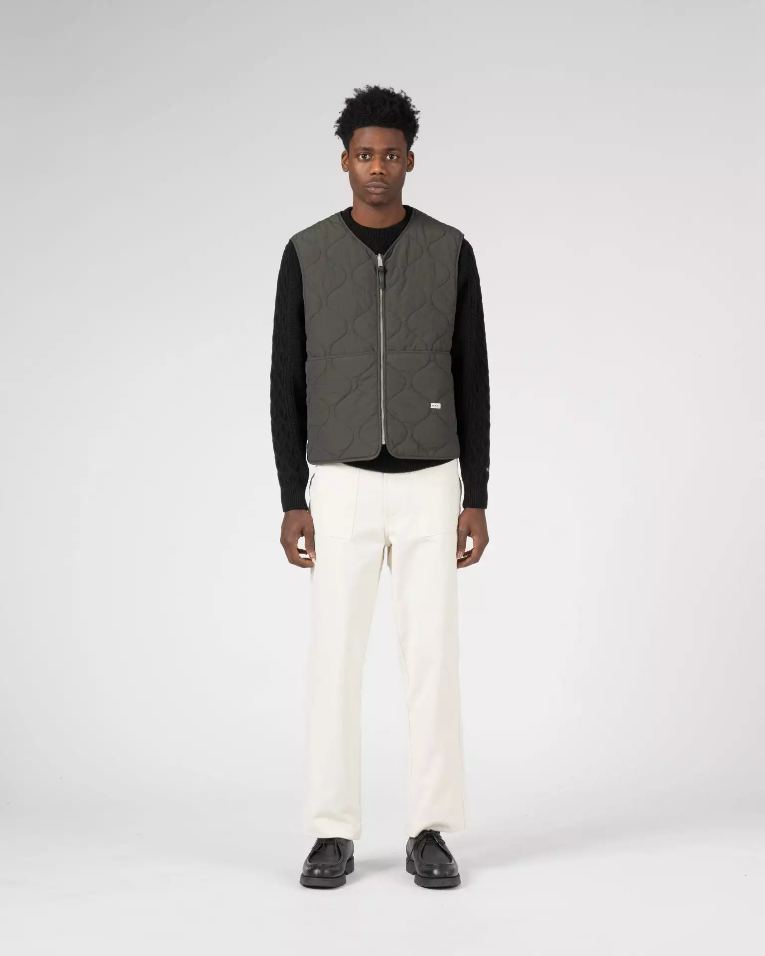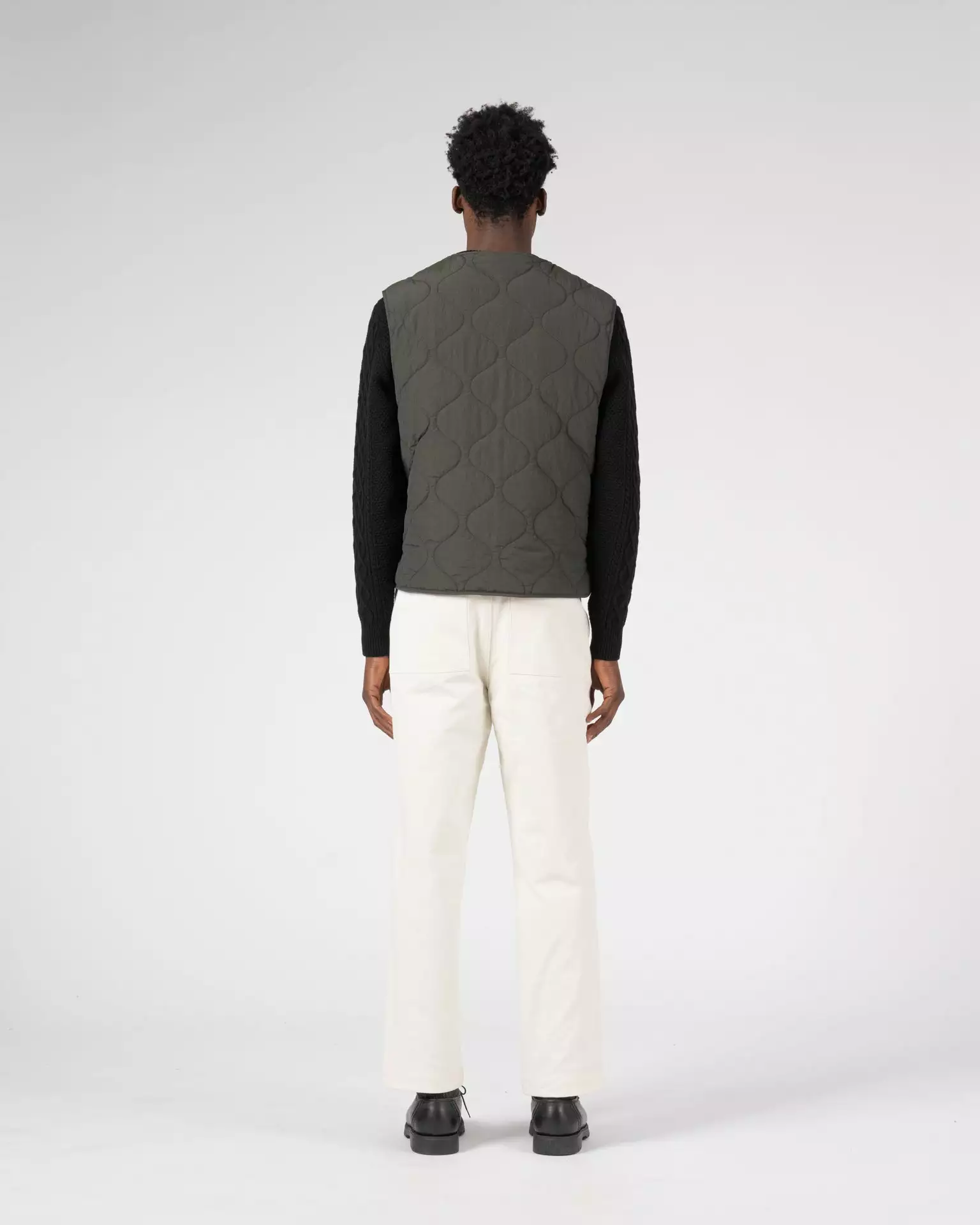 Made of a yarn dyed cotton and nylon woven sourced from the Italian mill Olmetex – technical experts in performance textiles. This fabric is water repellant and easy to care for. The fabric has been quilted with a featherless insulation, which replaces natural down, maintains warmth and regulates body temperature. The jacket is reversible featuring patch pockets on one side and a single left chest pocket on the other. Both sides of the jacket have a Knickerbocker label sewn on the left pocket.