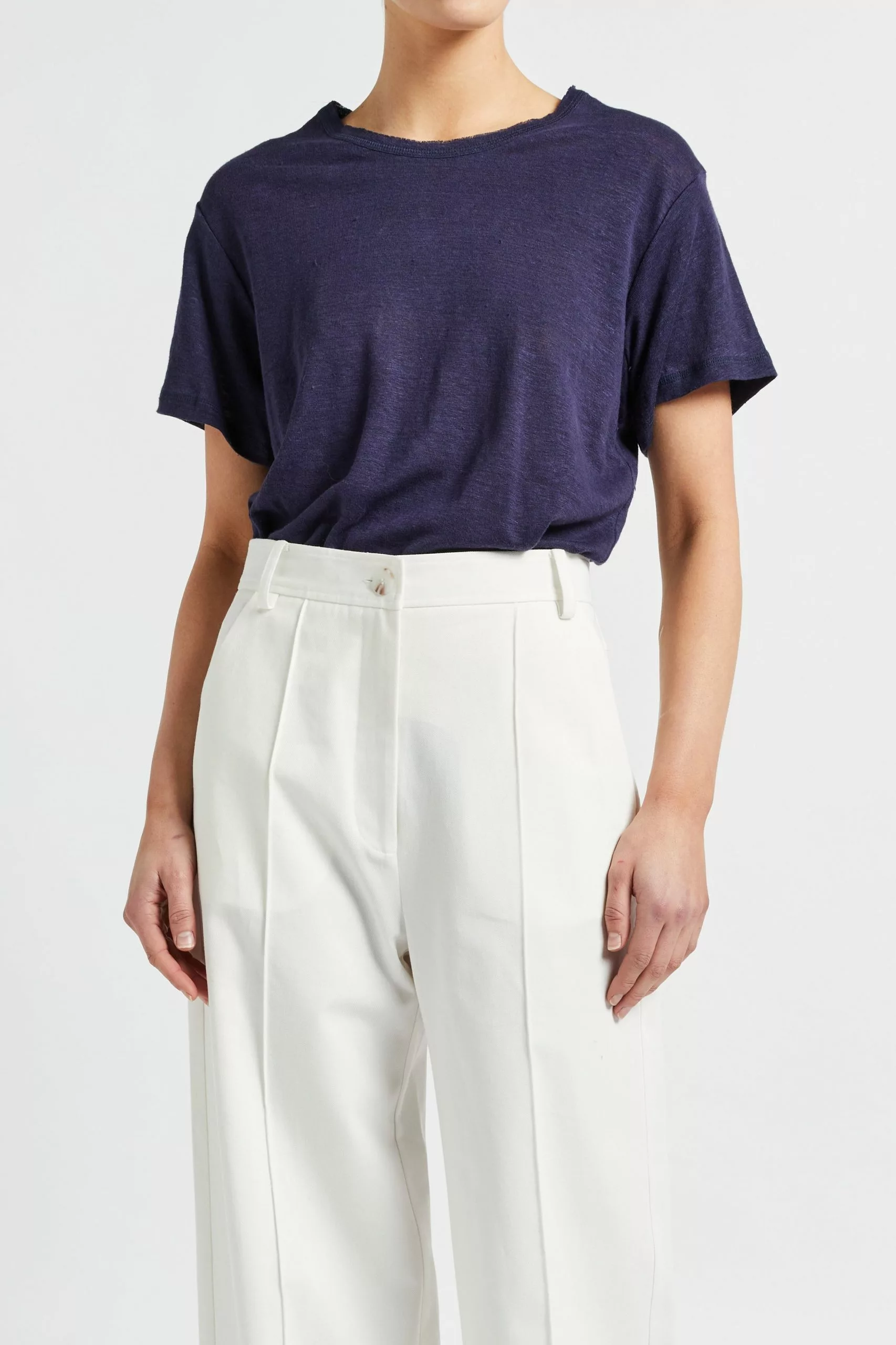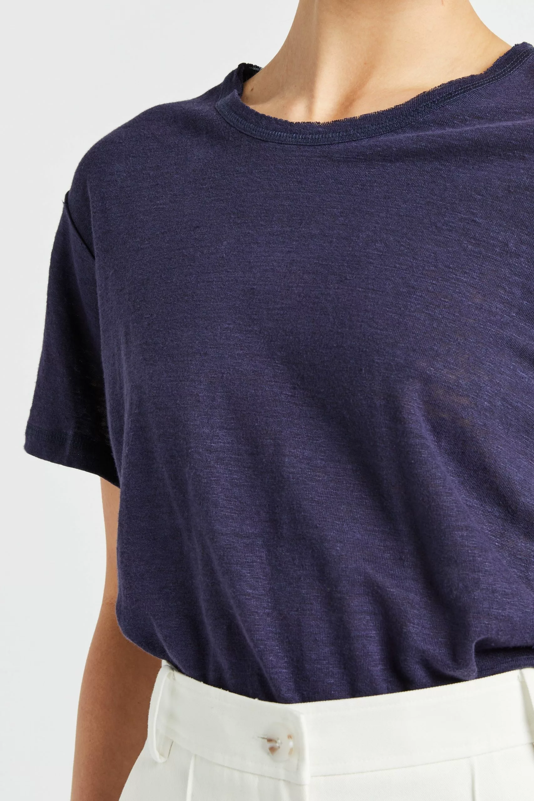The Tilly Linen Jersey Tee in Midnight is an LM essential and is made from 100% organic linen. This classic tee has a slim fit and features a double raw edge neck bind with cover-stitch detail on all hems and is finished with small side splits. Pair this versatile tee with silk satin separates or fleece depending on the occasion.